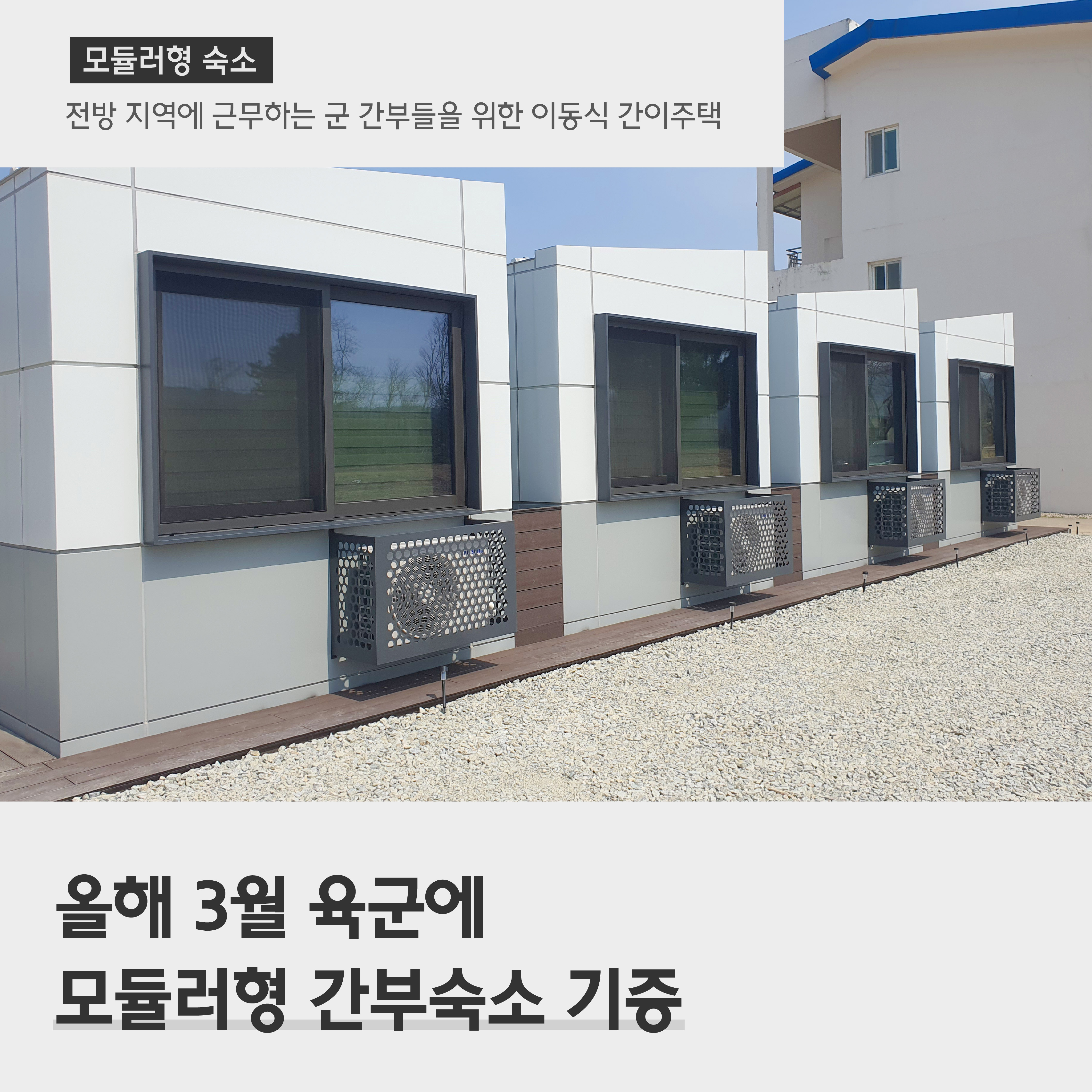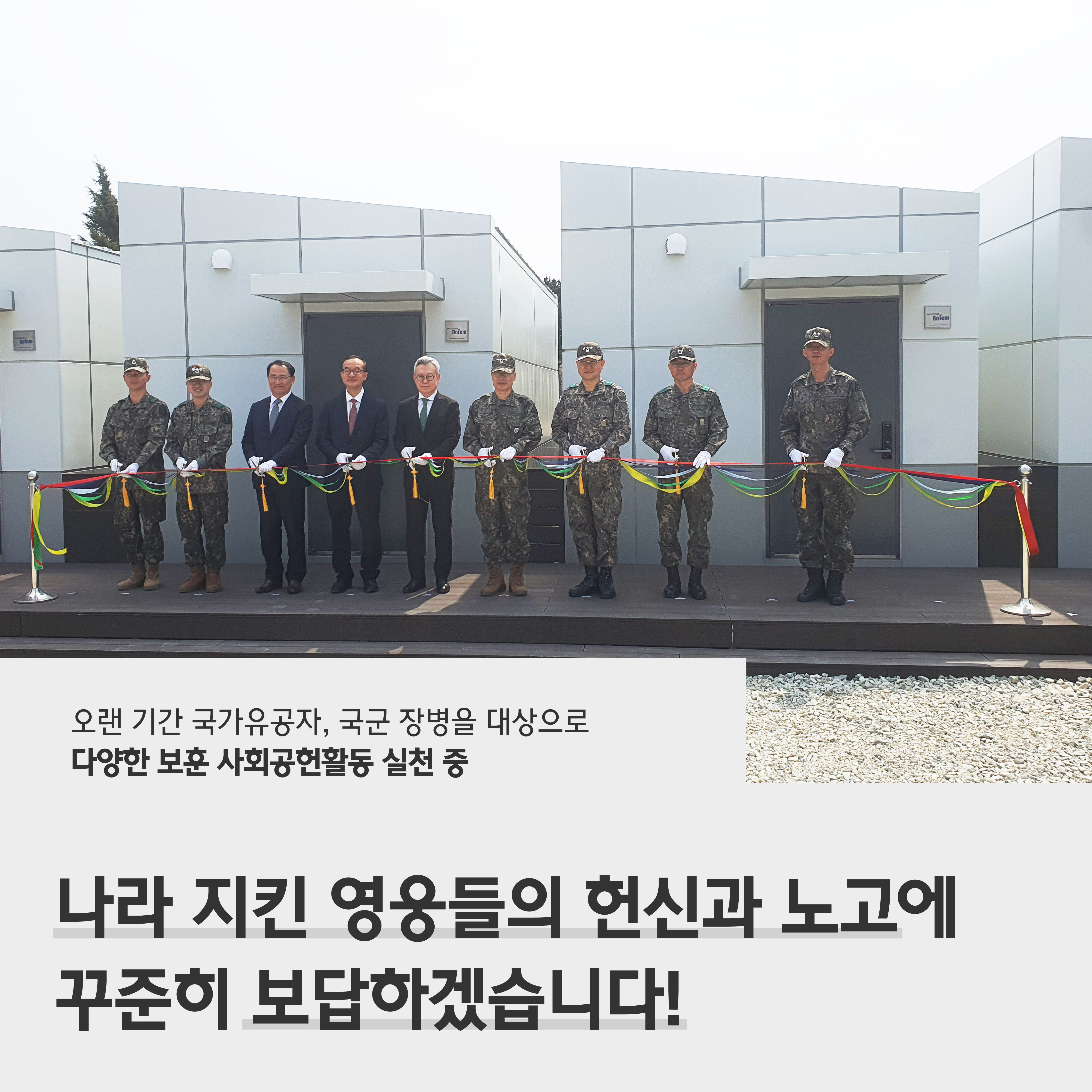 최근에는 국군의 복지향상을 위해 모듈러형 숙소를 기증했습니다. 모듈러형 숙소는 전방 지역에 근무하는 군 간부들을 위한 이동식 간이주택인데요. 모듈러형 숙소는 숙소를 짓기 어려운 지역에 간편히 설치할 수 있어 앞으로 부대 주둔지 이전 등에 더 효과적으로 대응할 수 있을 것으로 기대되고 있습니다.
