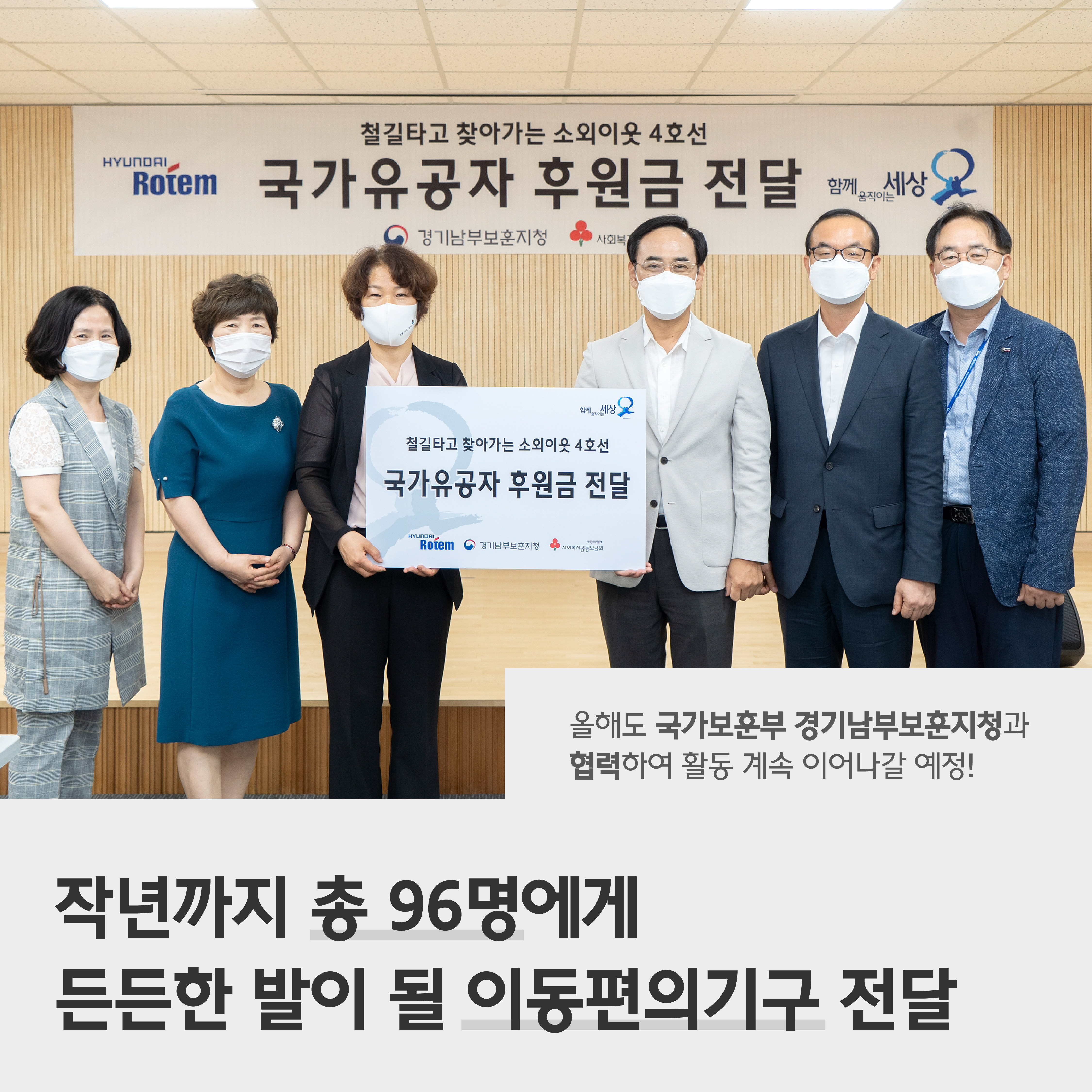 현대로템은 후원금을 통해 작년까지 총 96명의 참전 유공자에게 든든한 발이 되어줄 이동편의기구를 전달했는데요. 올해도 현대로템은 국가보훈부 경기남부보훈지청과 협력을 통해 활동을 계속 이어나갈 예정입니다.