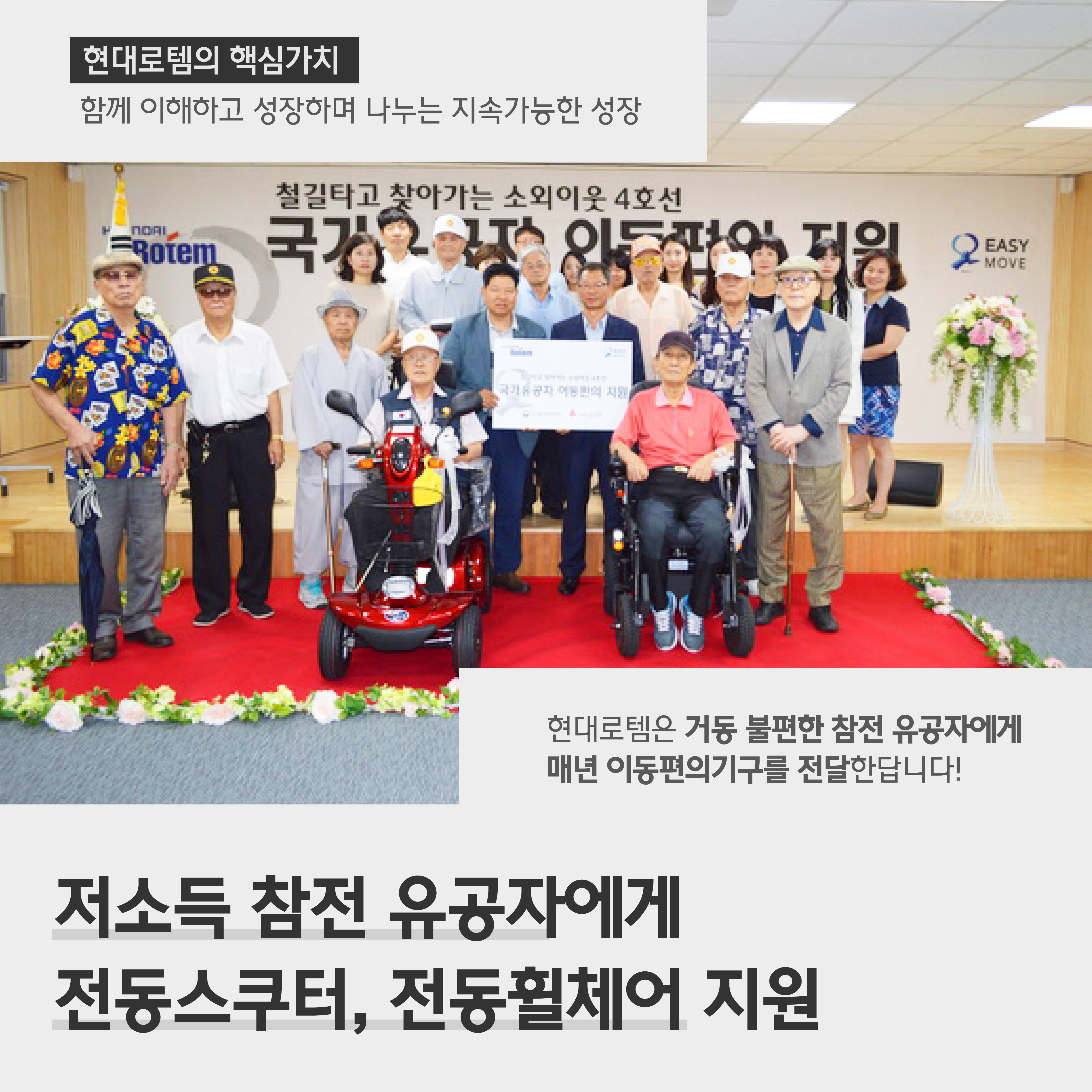 현대로템은 ‘함께 이해하고 성장하며 나누는 지속가능한 성장’이라는 핵심 가치 아래 보훈 문화를 전파하기 위해 많은 노력을 하고 있습니다. 그중 하나로 2017년부터 참전용사를 대상으로 이동편의 기구를 꾸준히 후원하고 있는데요.