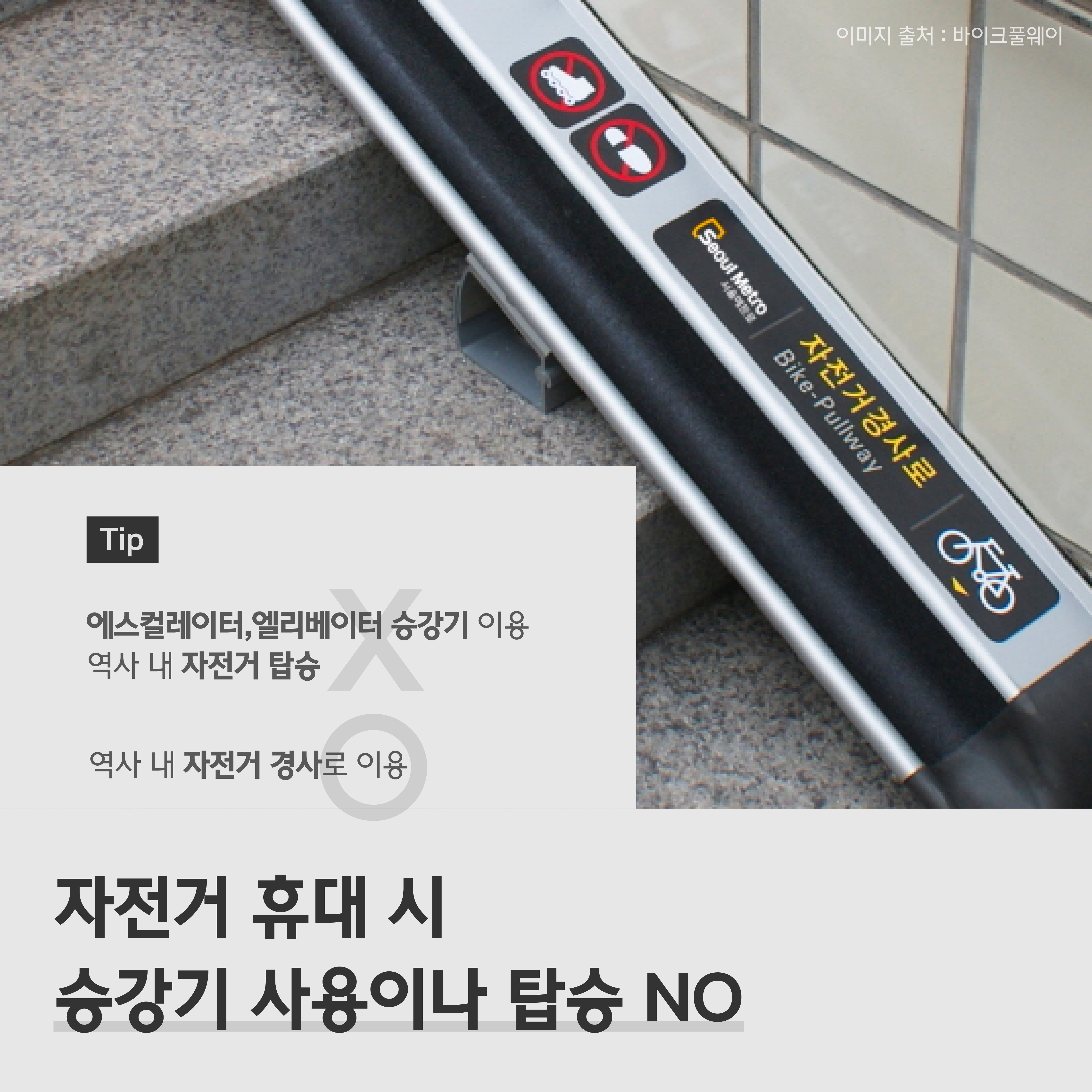 자전거 휴대 시 알아야 할 에티켓 먼저 살펴볼까요. 자전거는 에스컬레이터나 엘리베이터 등의 승강기를 이용할 수 없어요.
