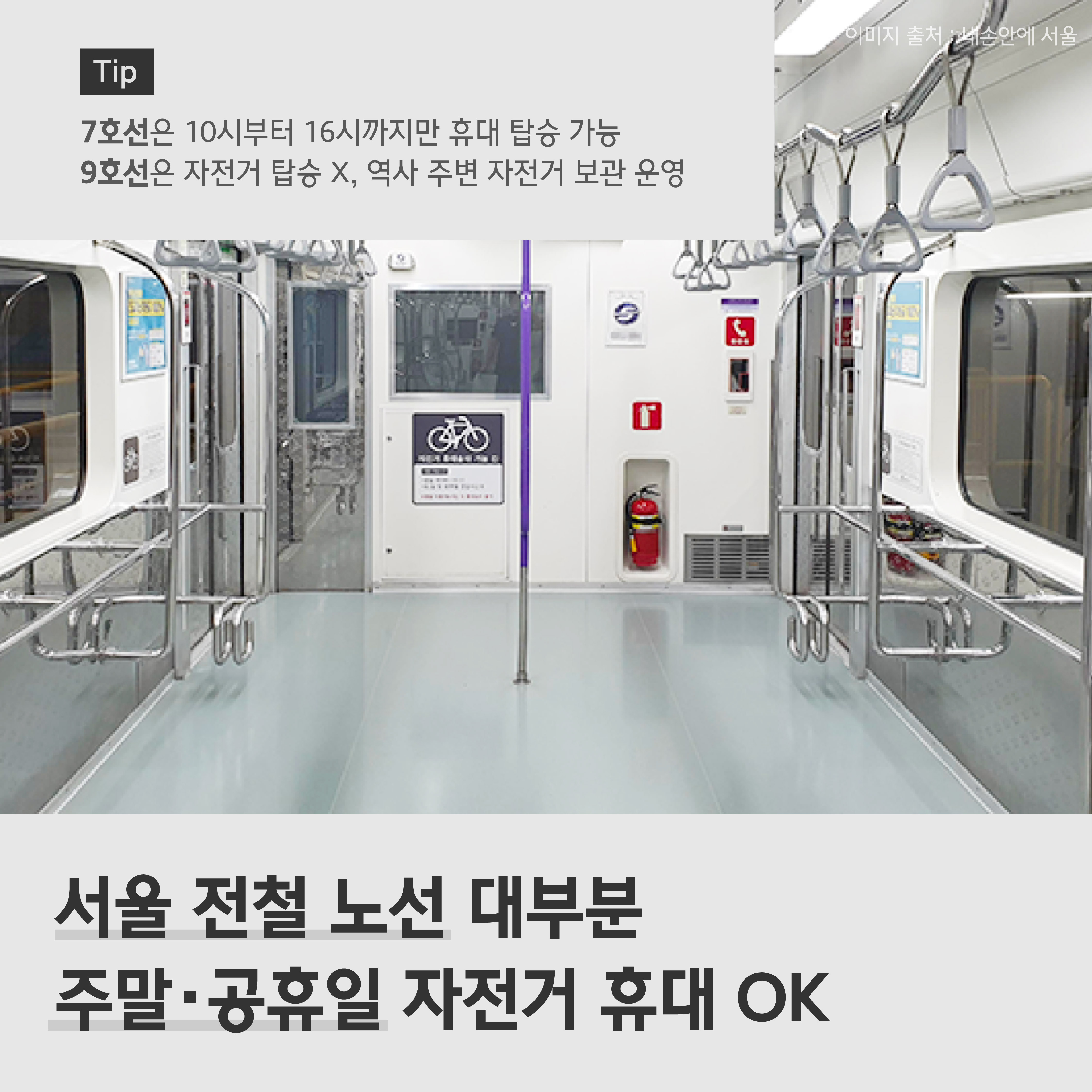 서울을 중심으로 1-8호선 전동차의 경우 주말과 법정공휴일에 한해 자전거 휴대 승차가 가능합니다. 단 7호선은 오전 10시부터 오후 4시까지 평일에도 자전거와 함께 탑승할 수 있어요.