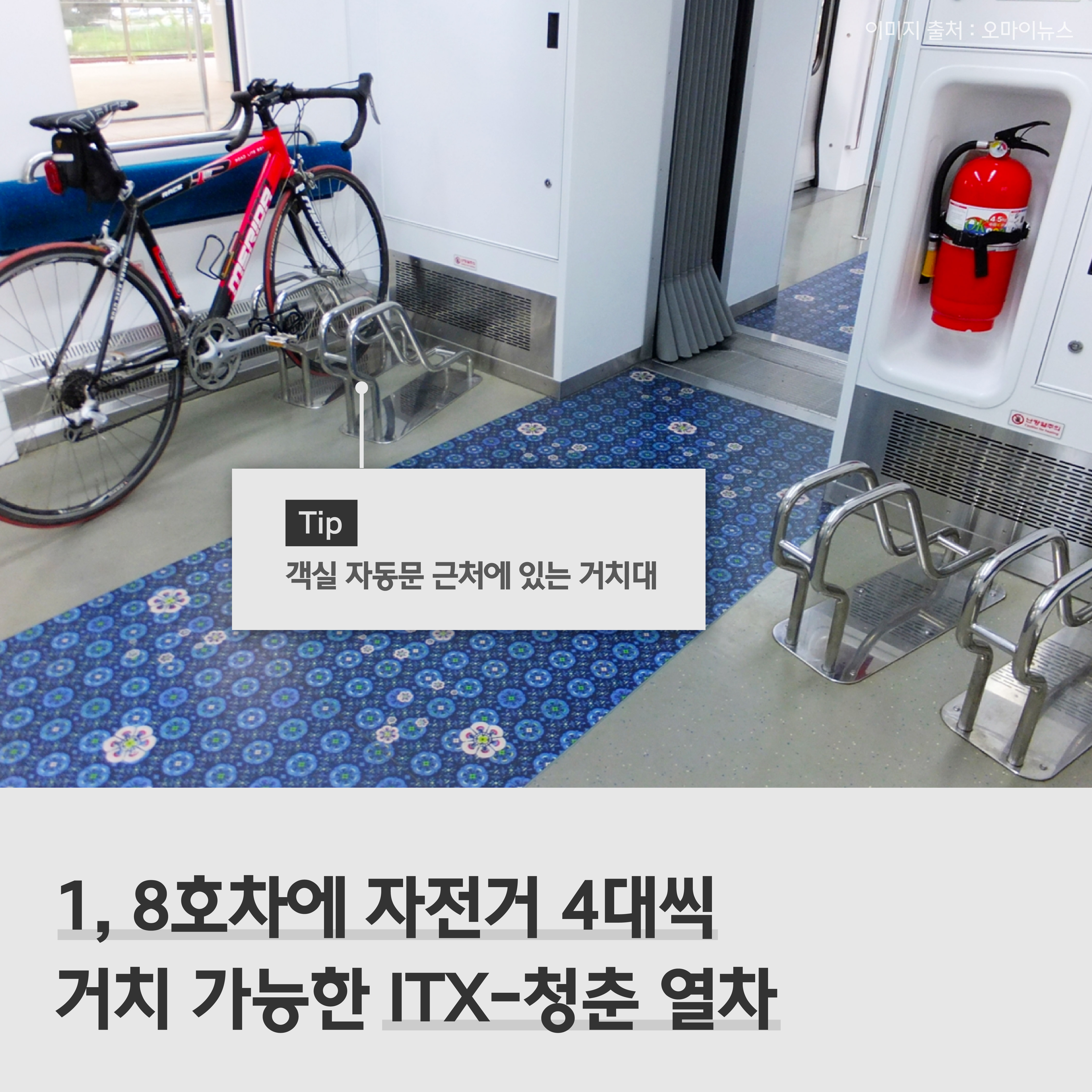 ITX청춘은 1호차와 8호차 양 끝에 자전거 거치대가 마련돼 있어요. 열차당 각 4대씩 총 8대의 자전거를 실을 수 있는데요.