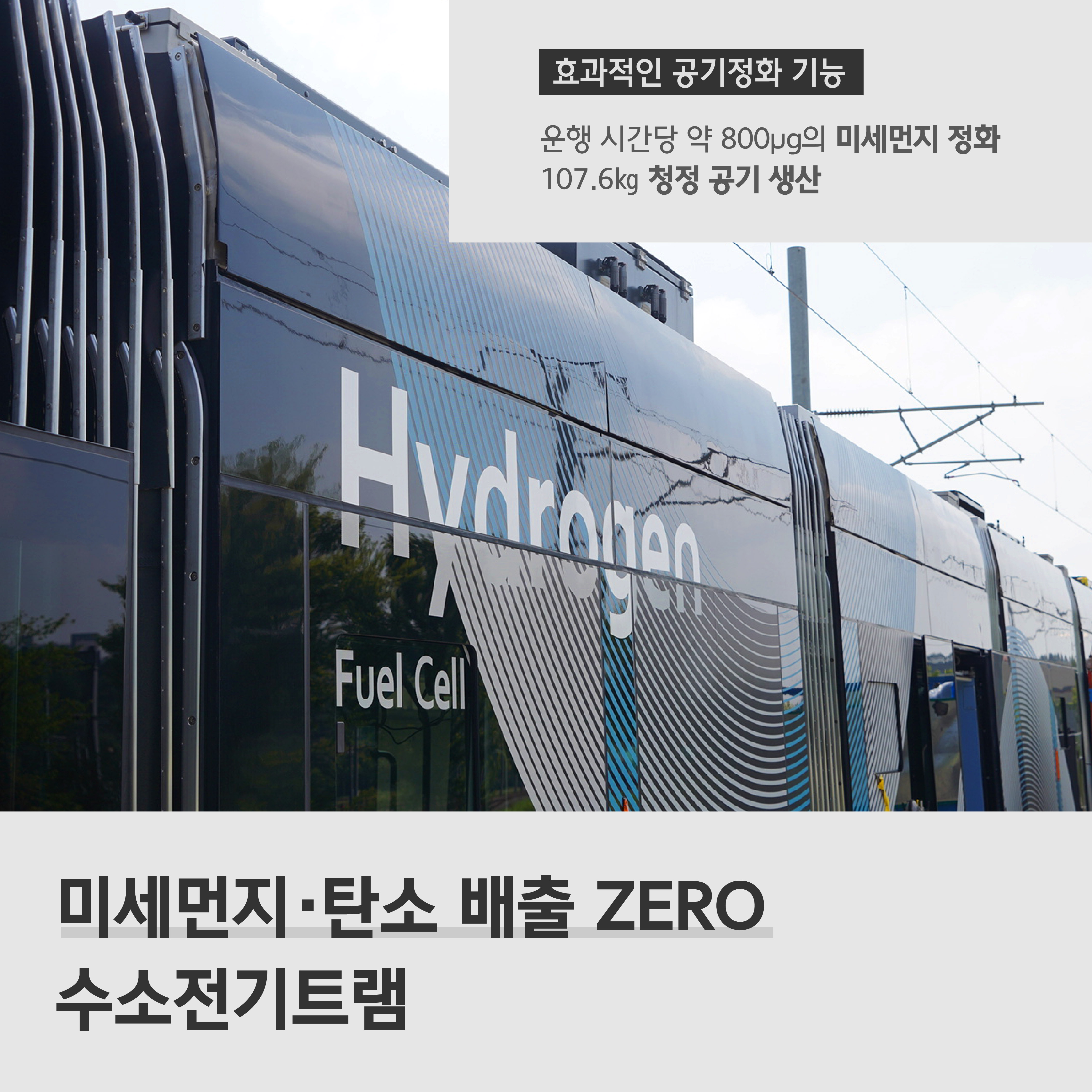 그렇다면 울산을 달리는 수소전기트램에 대해 더 자세히 알아볼까요. 현대로템이 개발, 제작한 수소전기트램은 차세대 친환경 교통수단으로 운행 시간당 약 800μg(마이크로그램)의 미세먼지를 정화하고 107.6㎏의 청정 공기를 생산하는데요. 10편성의 수소전기트램 운행 시 약 2만 3,000그루의 나무를 심는 효과를 냅니다.