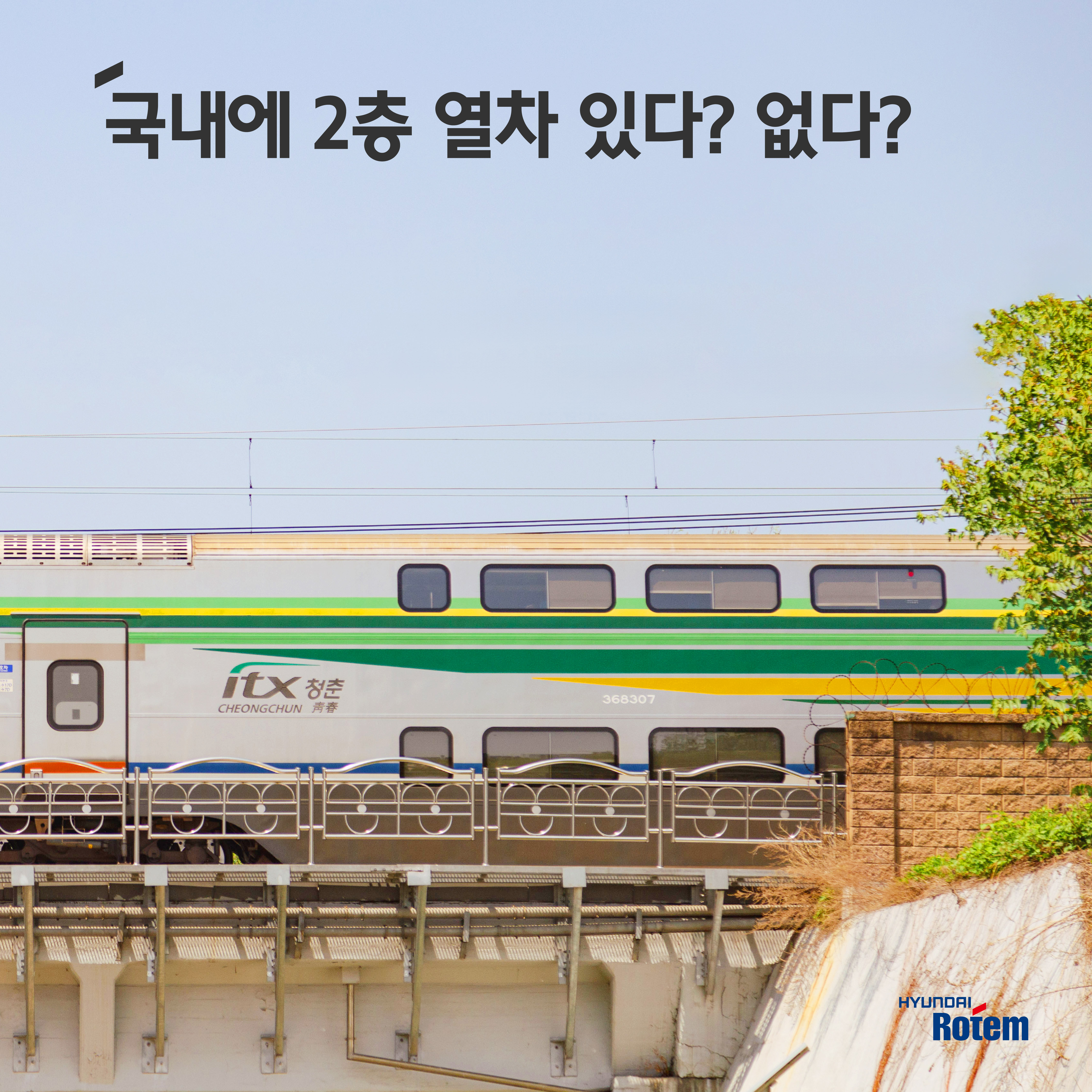 우리나라에는 2011년 현대로템이 납품한 총 64량의 ITX-청춘 전동차가 경춘선에 도입됐는데요. ITX-청춘은 국내서 유일하게 운행되는 2층 전동차로 최고 속도 180㎞/h까지 달릴 수 있어요. 용산에서 춘천까지 약 1시간 10분 만에 갈 수 있답니다.