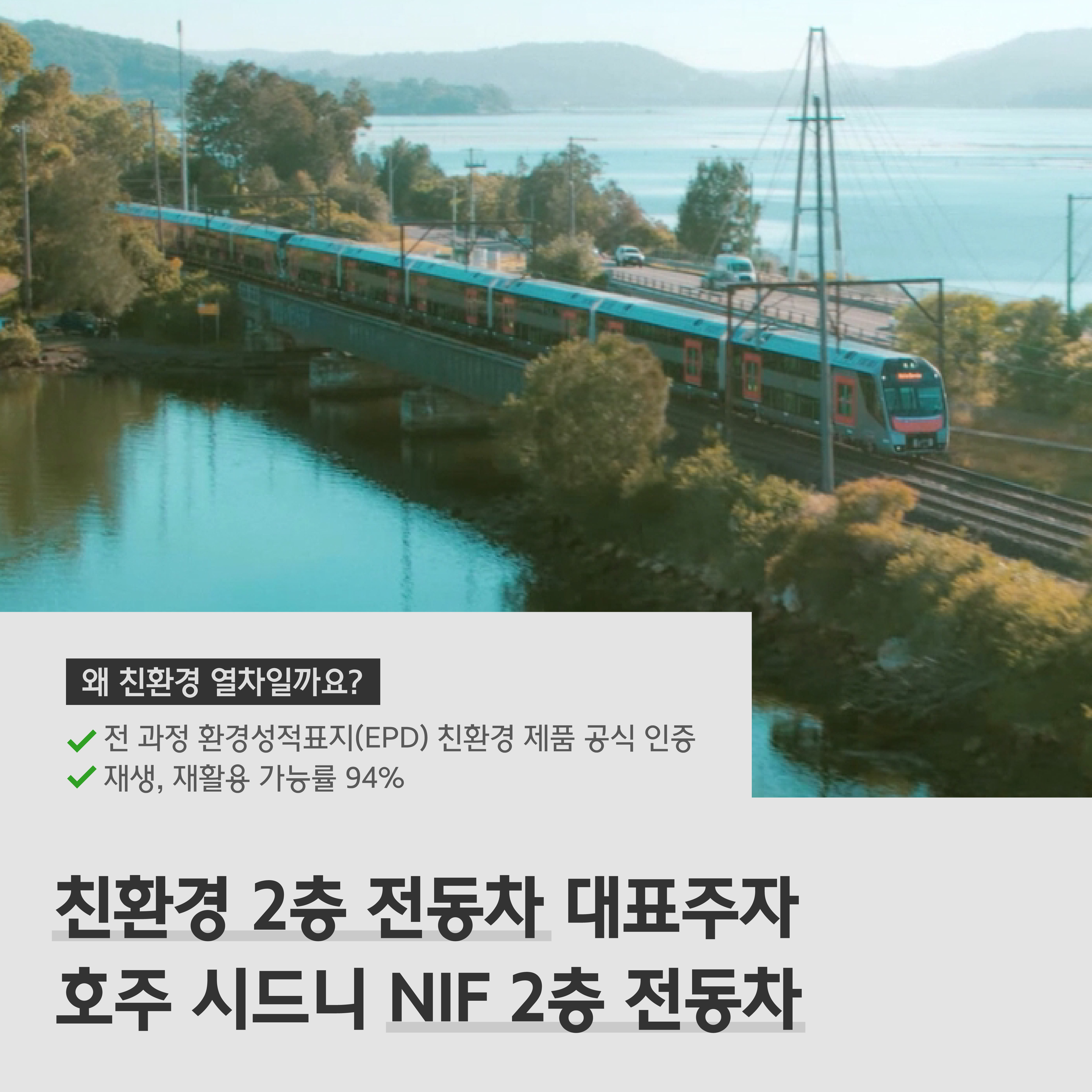 이제 해외로 가 볼게요. 현대로템은 2019년부터 호주 시드니에 610량의 2층 전동차를 납품 진행 중에 있는데요. NIF 2층 전동차는 최고 속도 160㎞/h로 호주 NSW 주 교외선에서 운행 중입니다. NIF 2층 전동차는 전 과정 환경성적표지(EPD) 친환경 제품으로 공식 인증을 받았으며 재생, 재활용 가능률이 무려 94%에 달해 업계에서 호평을 받고 있어요.