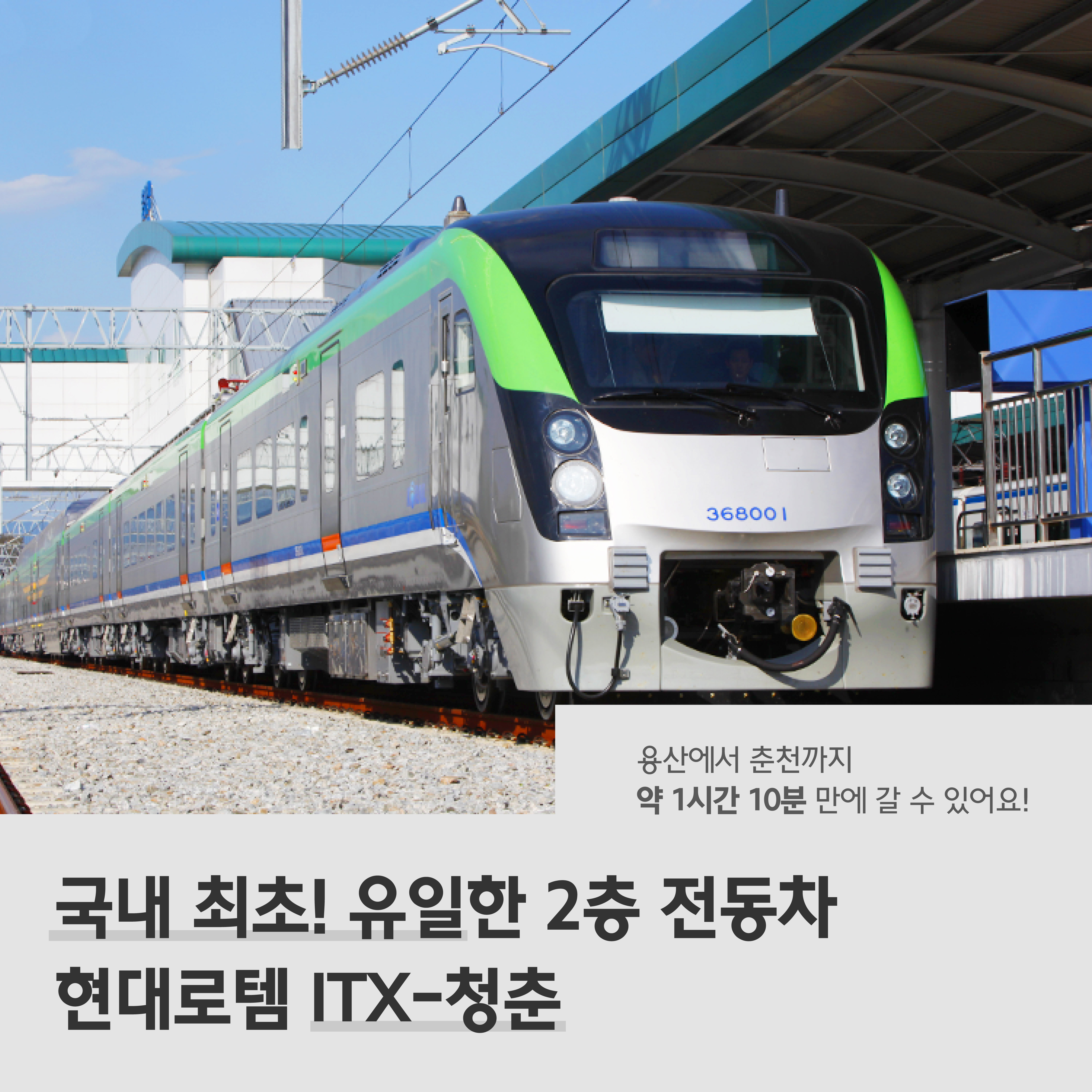 우리나라에는 2011년 현대로템이 납품한 총 64량의 ITX-청춘 전동차가 경춘선에 도입됐는데요. ITX-청춘은 국내서 유일하게 운행되는 2층 전동차로 최고 속도 180㎞/h까지 달릴 수 있어요. 용산에서 춘천까지 약 1시간 10분 만에 갈 수 있답니다.