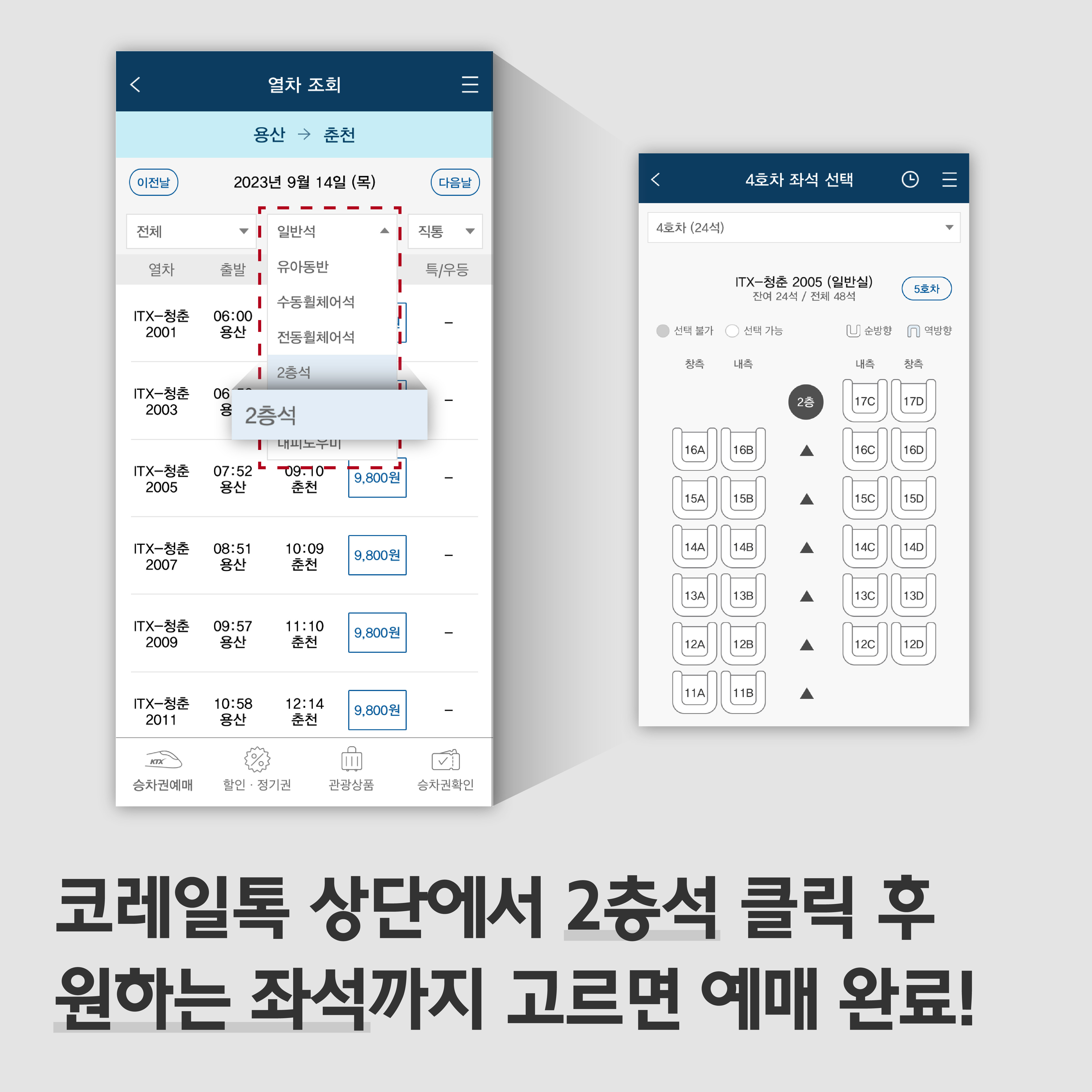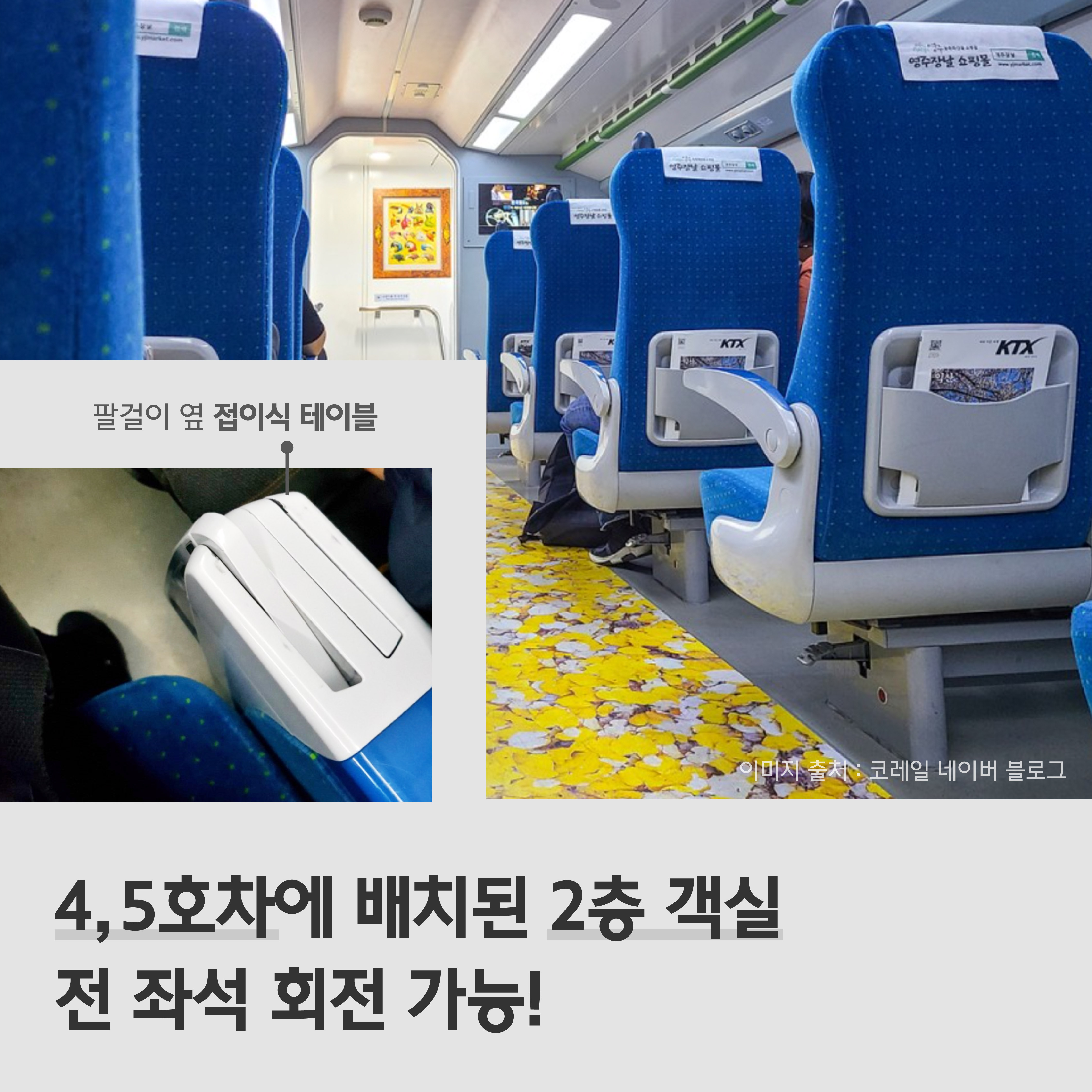 2층 객실은 4, 5호차에 배치돼 있는데요. 국내 유일의 2층 전동차인 만큼 2층 좌석을 원하는 승객들이 많아 가장 먼저 매진된다고 해요. 특히 2층 좌석은 팔걸이 옆에 개별 접이식 테이블이 있고 가족, 친구들과 마주 보고 갈 수 있도록 좌석 회전이 가능합니다.