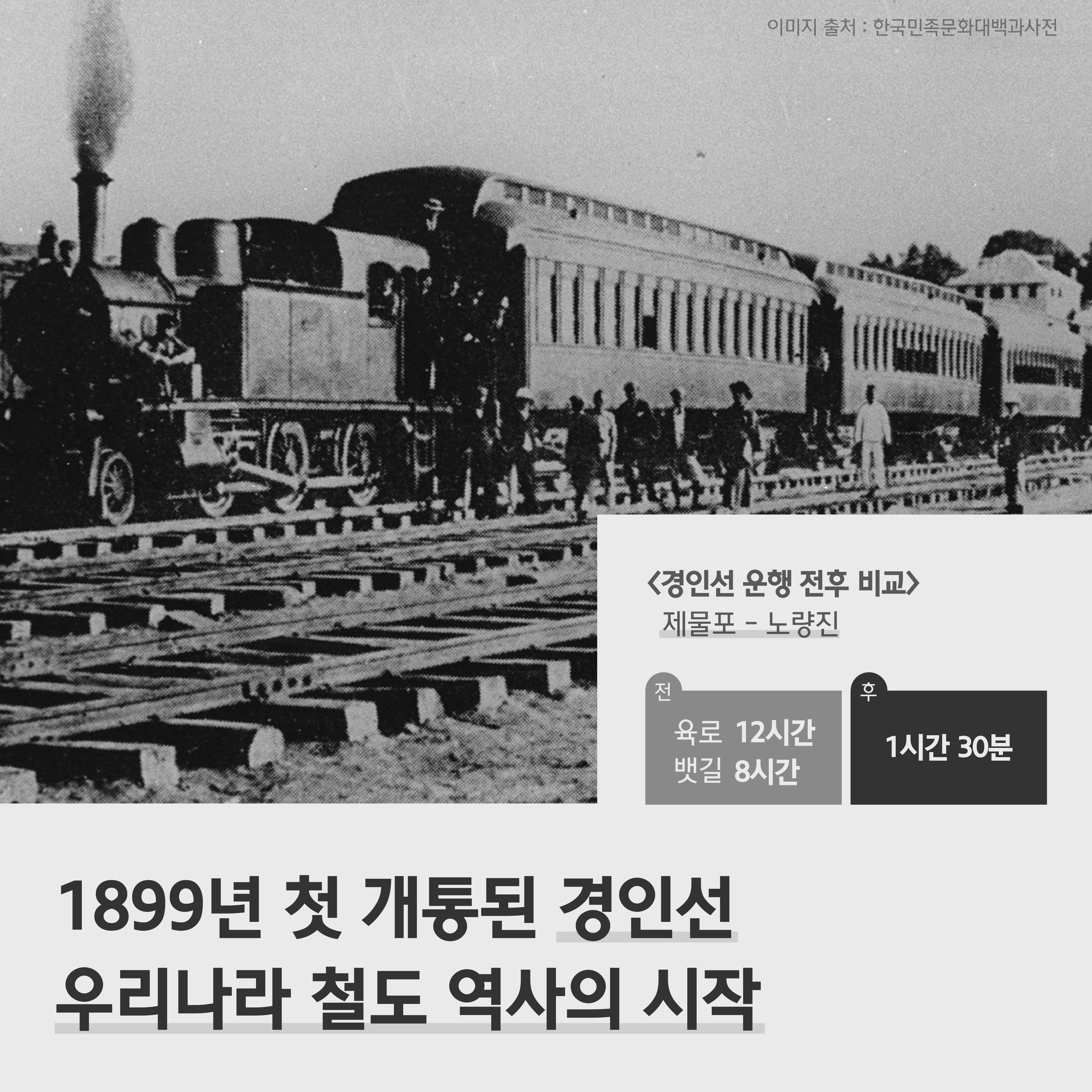 우리나라엔 1899년에 철도가 처음 운행됐어요. 서울의 노량진과 제물포(현재 인천)를 잇는 경인선으로, 이동하는 데 약 1시간 30분이 걸렸는데요. 당시 인천에서 서울까지 육로로 12시간, 한강 뱃길로 8시간 소요됐다고 하니 철도가 얼마나 혁신적인 발명품이었는지 다시금 깨달을 수 있죠.