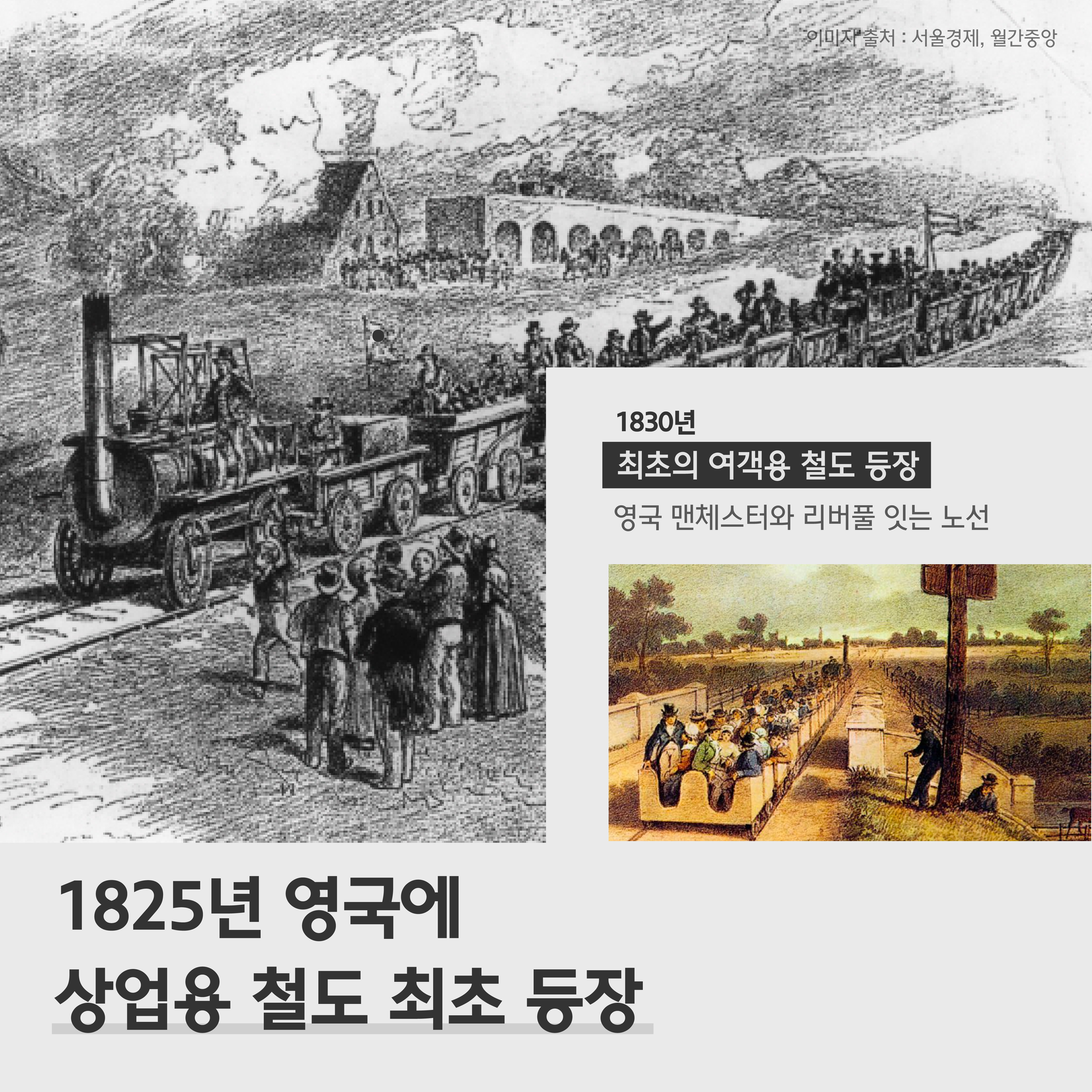 이후 5년 뒤인 1830년 영국 맨체스터와 리버풀을 잇는 최초의 여객용 철도가 개통됩니다. 승객을 태우고 레일 위를 달린 최초의 열차인 것이죠. 영국을 시작으로 나라 곳곳에 철도가 점차 보급, 전파되는데요.