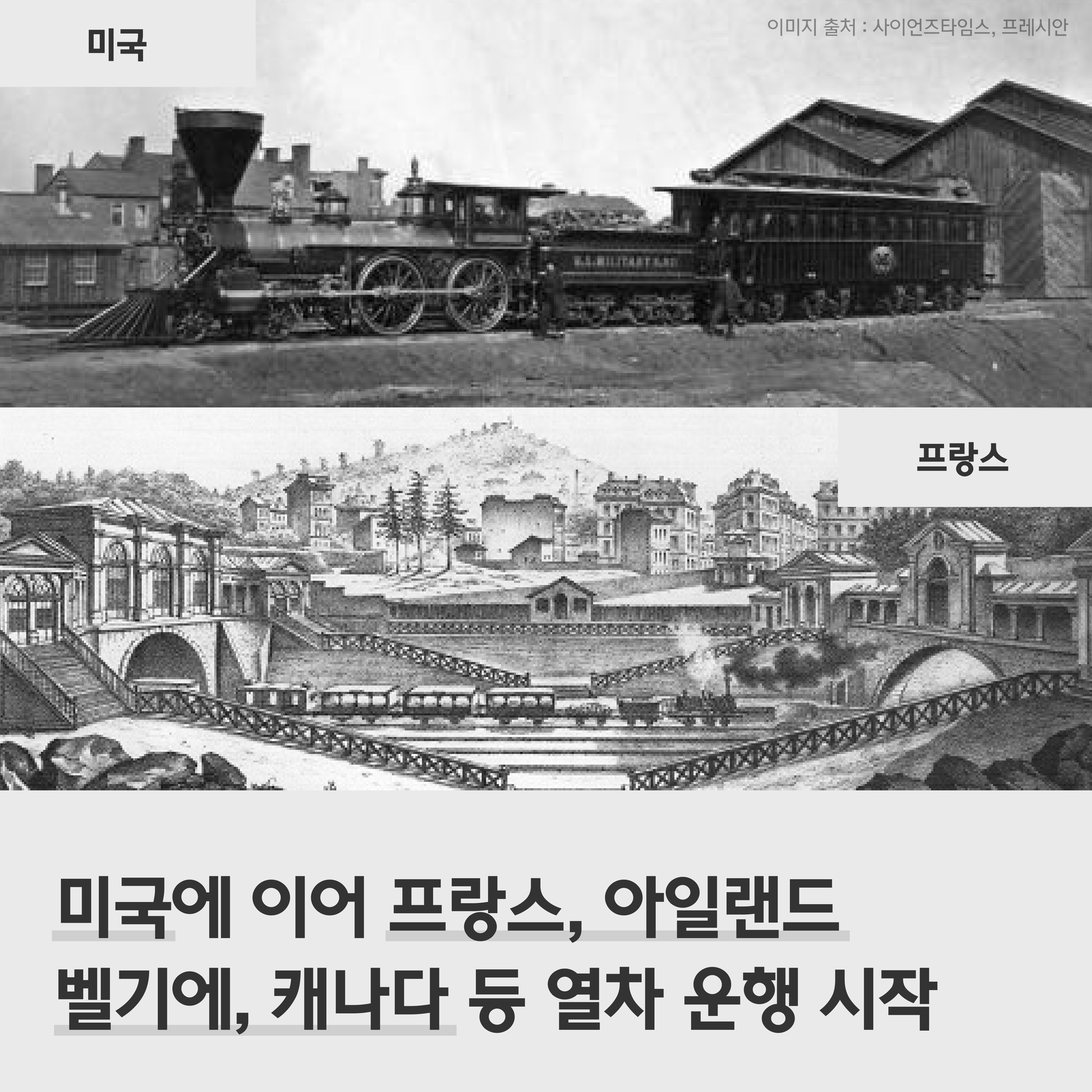 미국은 ‘볼티모어·오하이오 철도회사’가 1830년 5월 볼티모어에서 메릴랜드주까지 21㎞(13마일)의 철도를 개통했으며 이어서 프랑스, 아일랜드, 벨기에, 캐나다 등이 열차 운행을 실시하게 됩니다.
