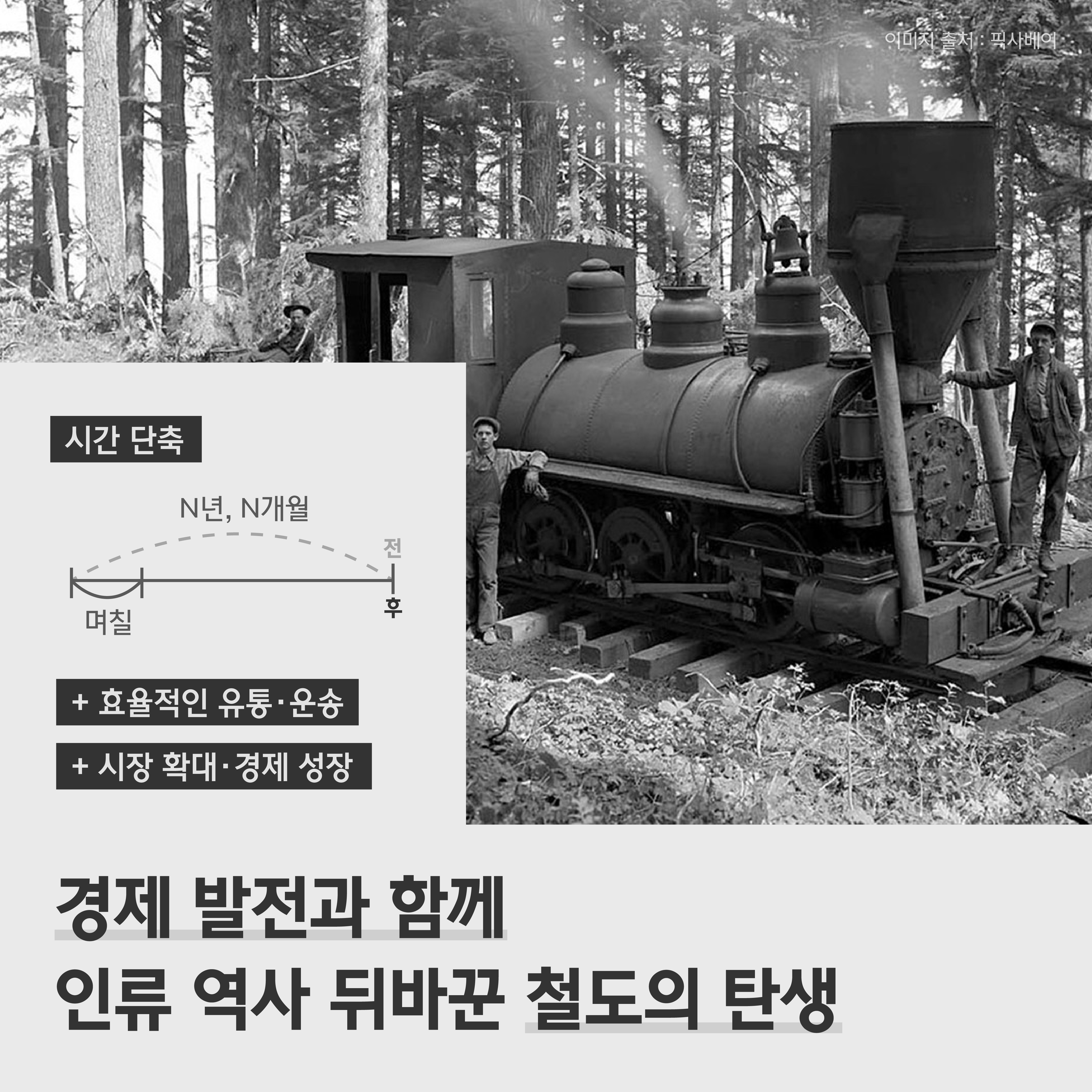 하지만 철도가 생겨난 후 사람들의 삶은 획기적으로 변했는데요. 걸어서 몇 년, 몇 개월이 걸리던 거리를 며칠이면 갈 수 있게 되면서 경제 발전에 큰 역할을 하게 됐습니다. 특히 상품과 원자재를 철도로 빠르고 안전하게 운송할 수 있게 돼 생산과 유통의 효율성이 높아짐에 따라 지역 간 거리와 시간의 제약이 크게 줄어 시장 확대와 경제 성장이라는 결과도 가져왔어요.