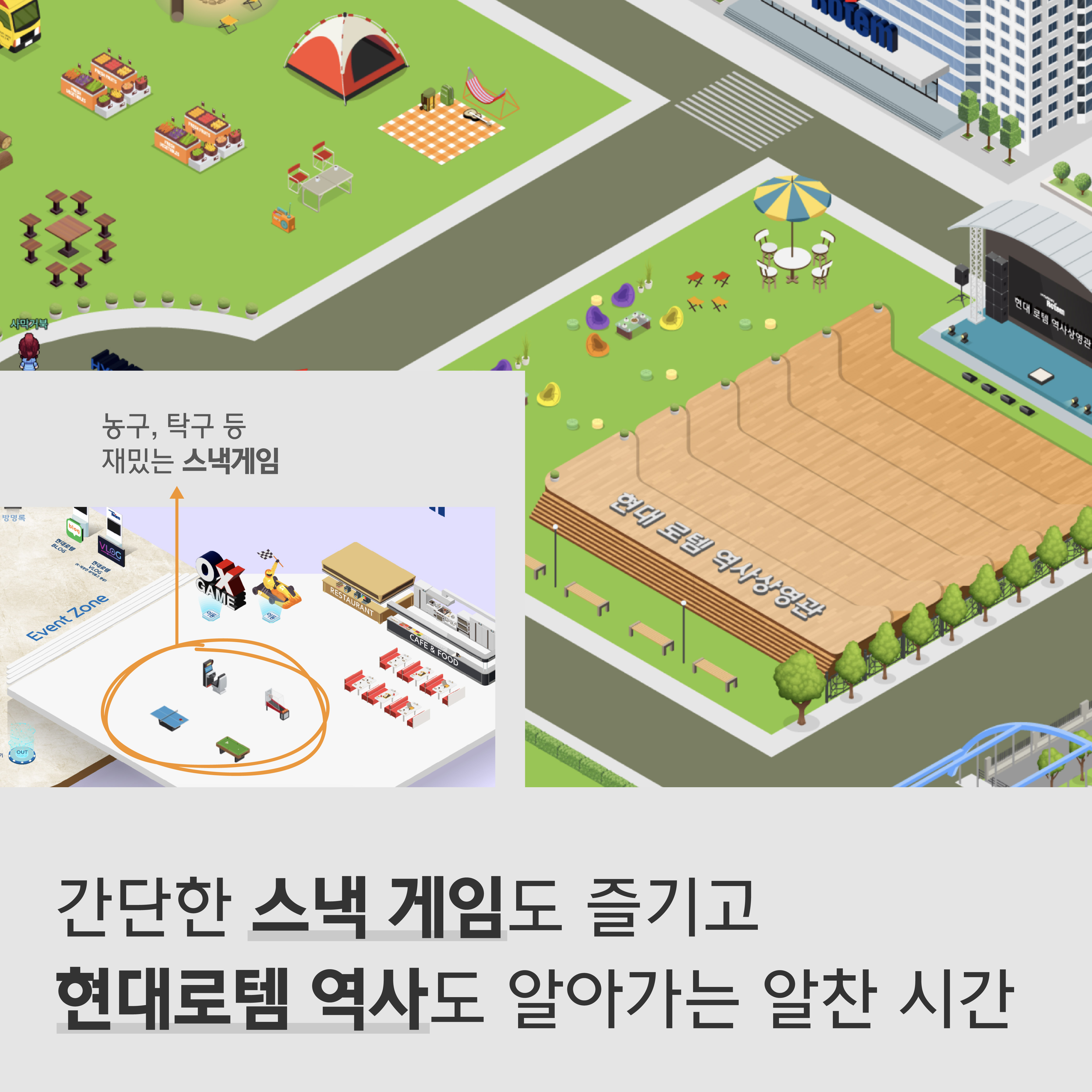 다음 이벤트 존으로 이동해 볼까요. 해당 존은 레스토랑, 카페 등 아기자기하게 꾸며져 있는 공간이에요. 한쪽에는 탁구, 농구 등 재밌는 스낵 게임들이 마련돼 있는데요. 머리도 식힐 겸 가볍게 게임 한 판 하고 가세요. 참고로 OX게임과 레이싱 게임은 전사 교육이나 행사 시에 만나볼 수 있답니다.