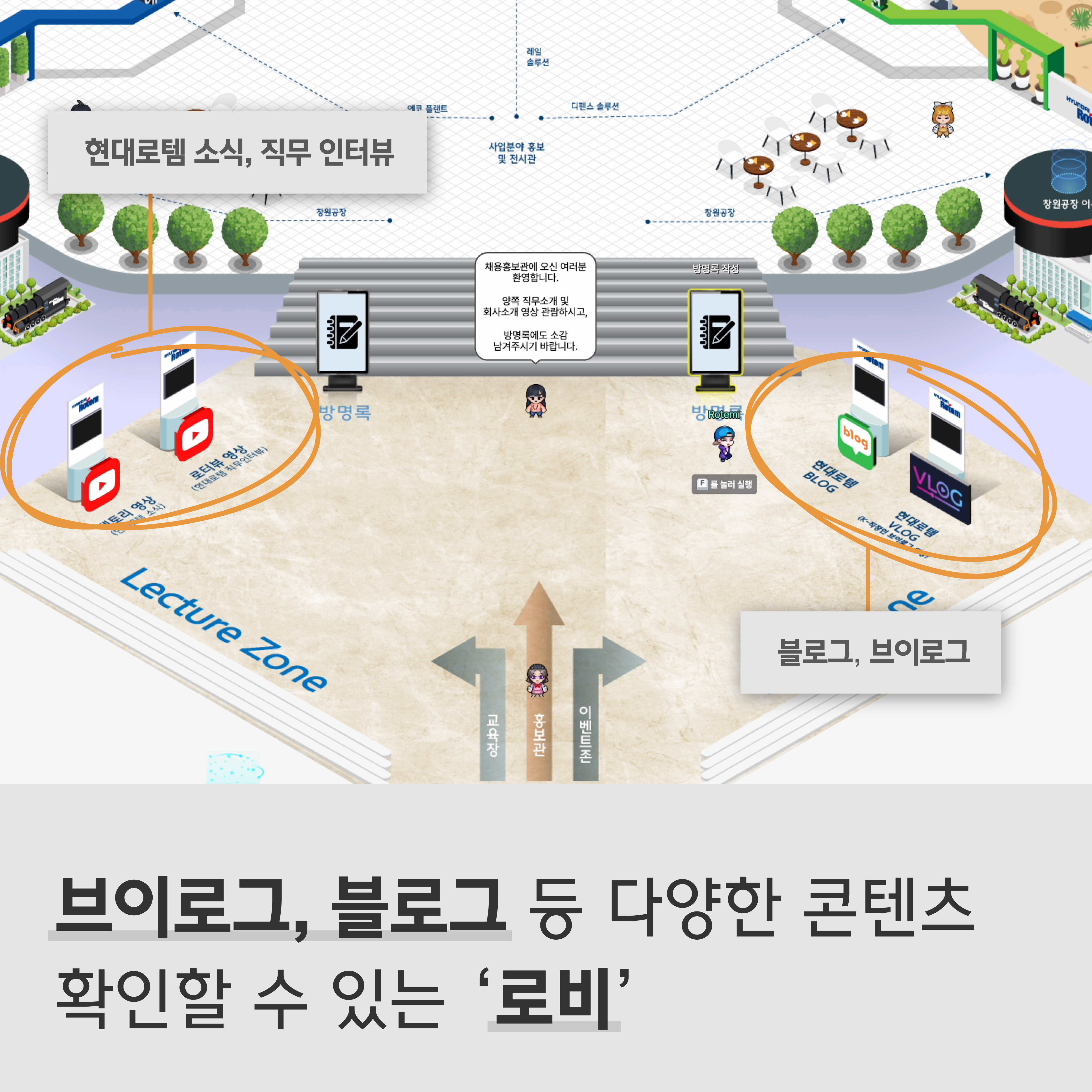 메타버스 투어는 현대로템 신규 채용 홈페이지(recruiter.co.kr)에서 할 수 있어요. 회사소개 칸 내 ‘About 현대로템’에서 메타버스 회사투어 버튼을 누르면 바로 접속할 수 있습니다. 메타버스 플랫폼에 접속하면 제일 먼저 의왕 연구소 로비가 보이는데요. 여기서는 현대로템 유튜브와 공식 블로그 등 다양한 콘텐츠를 구경할 수 있습니다.
