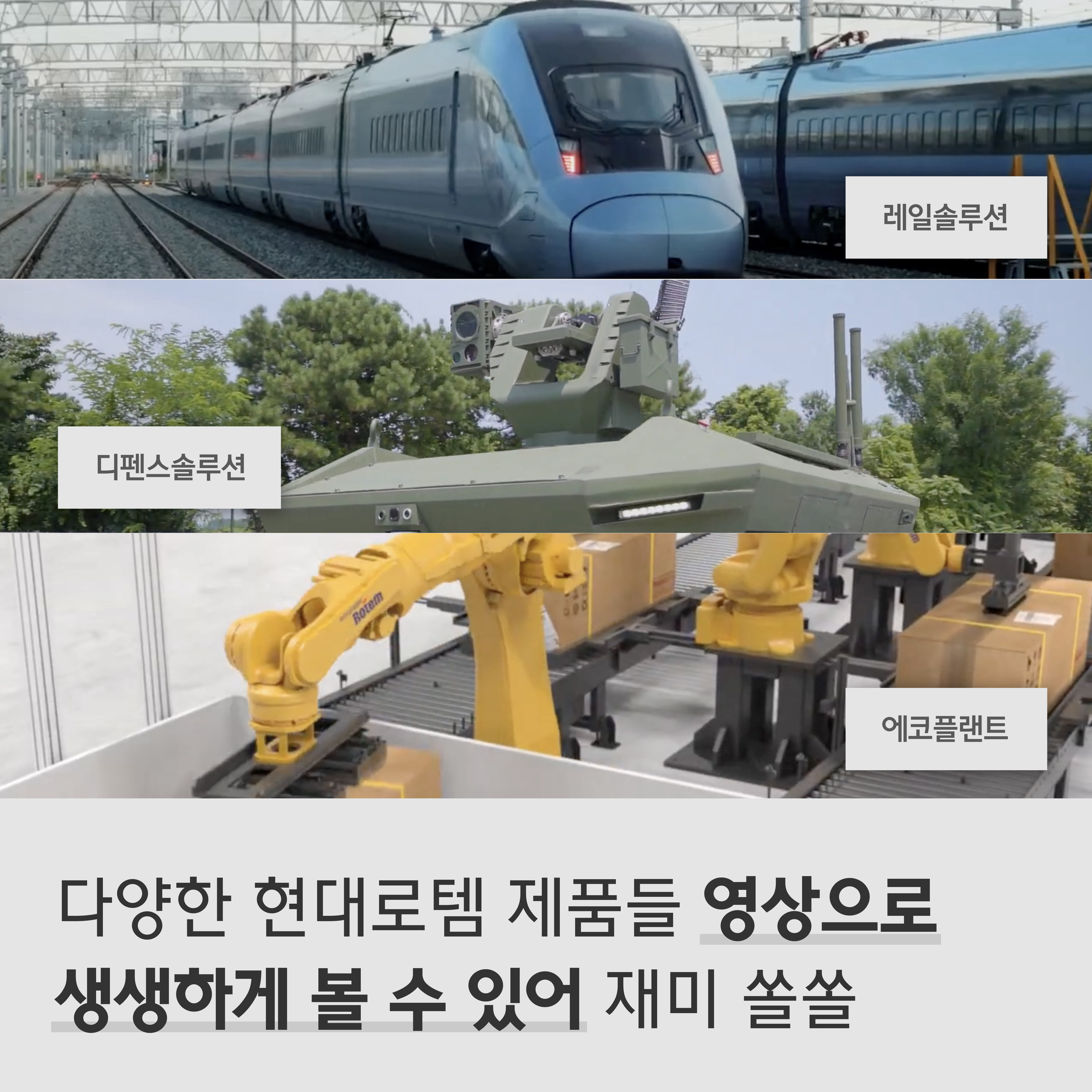로비에서 앞으로 직진하면 홍보관으로 갈 수 있는데요. 홍보관에는 현대로템의 3개 대표 부문인 레일솔루션, 디펜스 솔루션, 에코플랜트 사업을 한 번에 확인할 수 있어요. 각 부문별 대표 영상과 함께 제품들을 구경할 수 있어 보는 재미가 쏠쏠합니다.