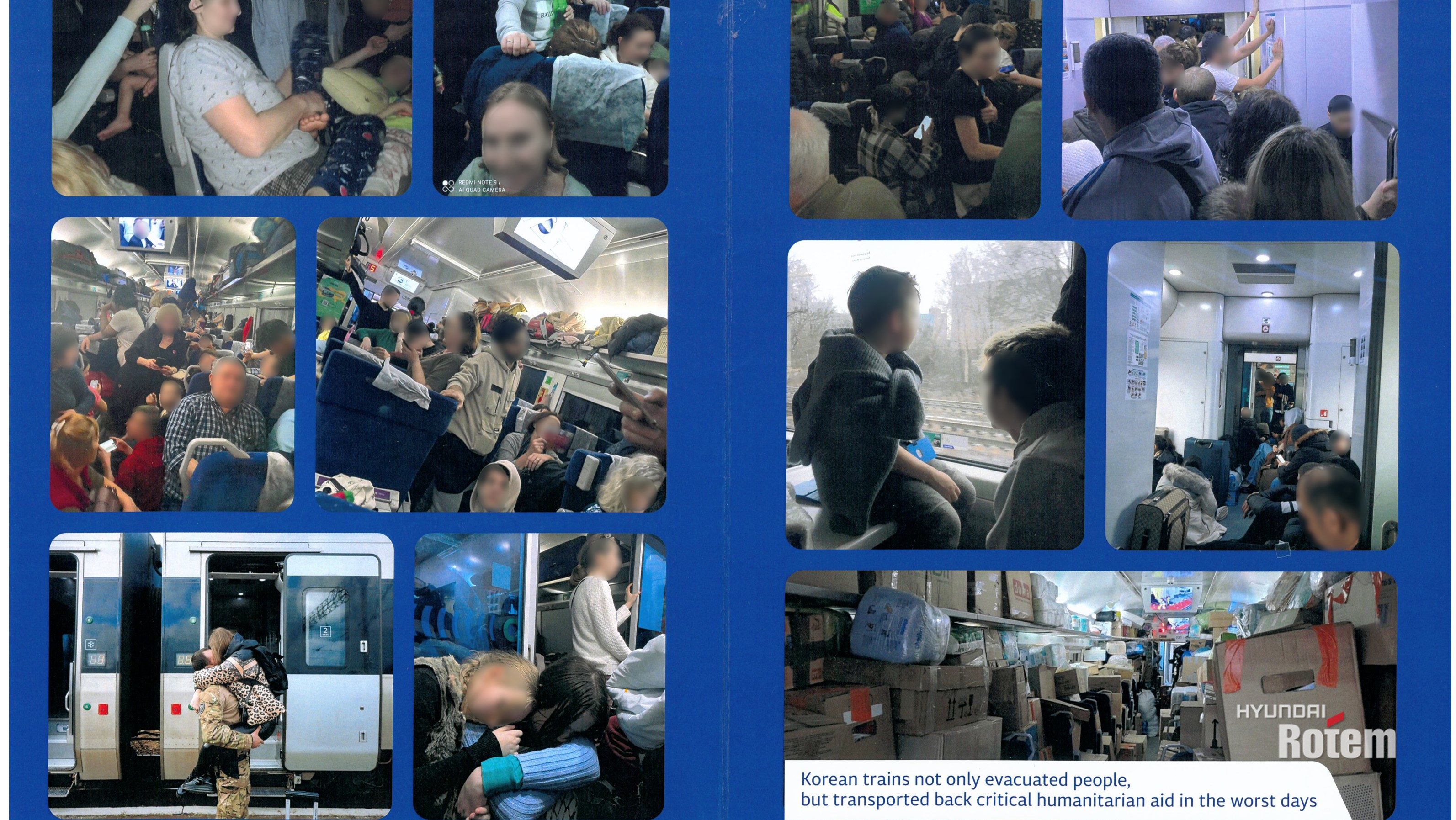 팸플릿 전반에는 현대로템이 납품한 현지 철도차량 안팎에서 포착된 가족, 연인 단위 피난민들의 사진 17장도 함께 수록됐습니다. 사진은 피난길에 오르고 있는 현지 분위기를 고스란히 담아내고 있습니다.