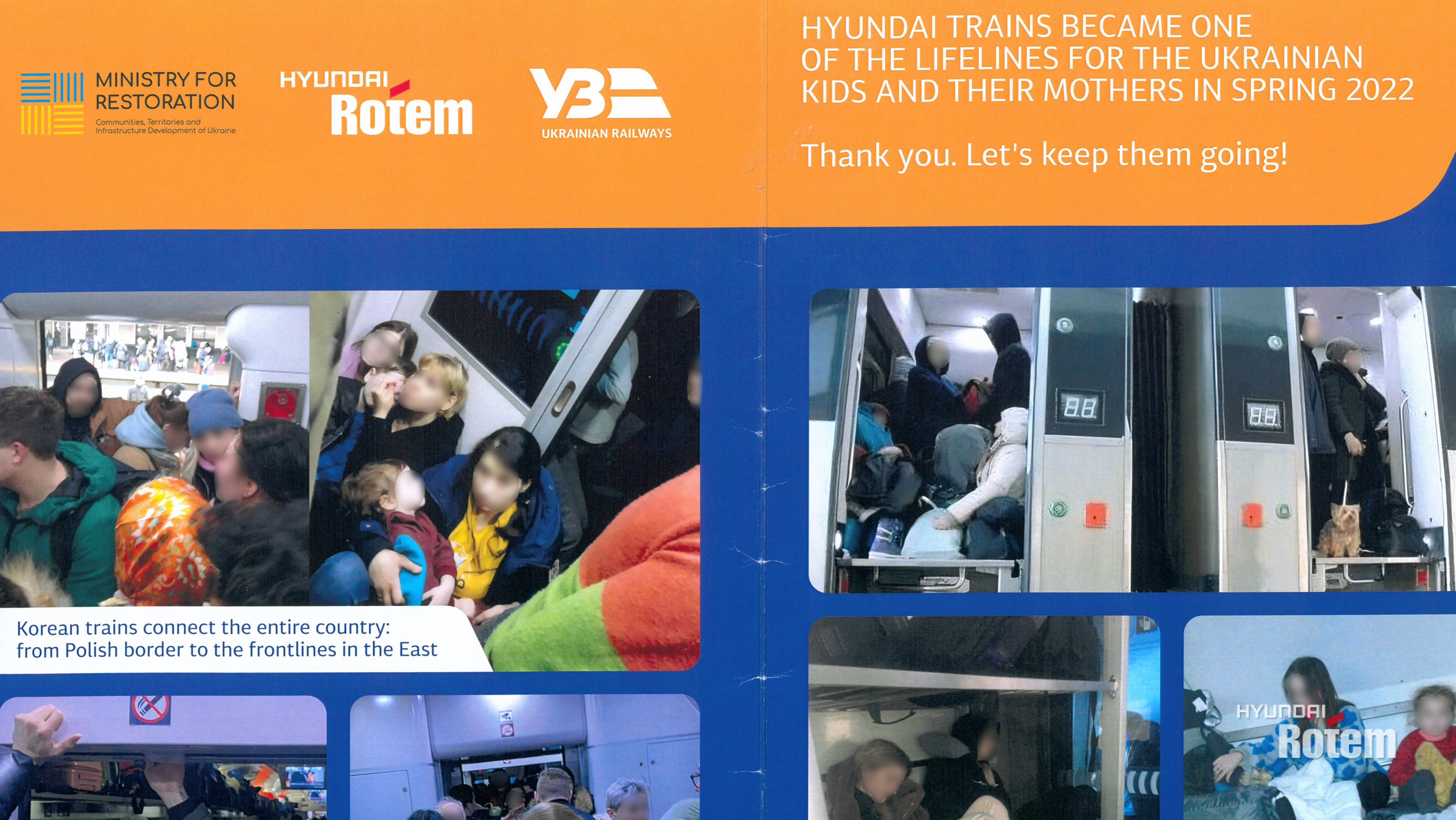 현대로템은 우크라이나에 납품한 철도차량이 전쟁 피난민들을 안전하게 대비시키는 데 핵심 역할을 수행한 공로로 현지 정부로부터 감사의 의미를 담은 팸플릿을 전달받았다고 11일 밝혔습니다.