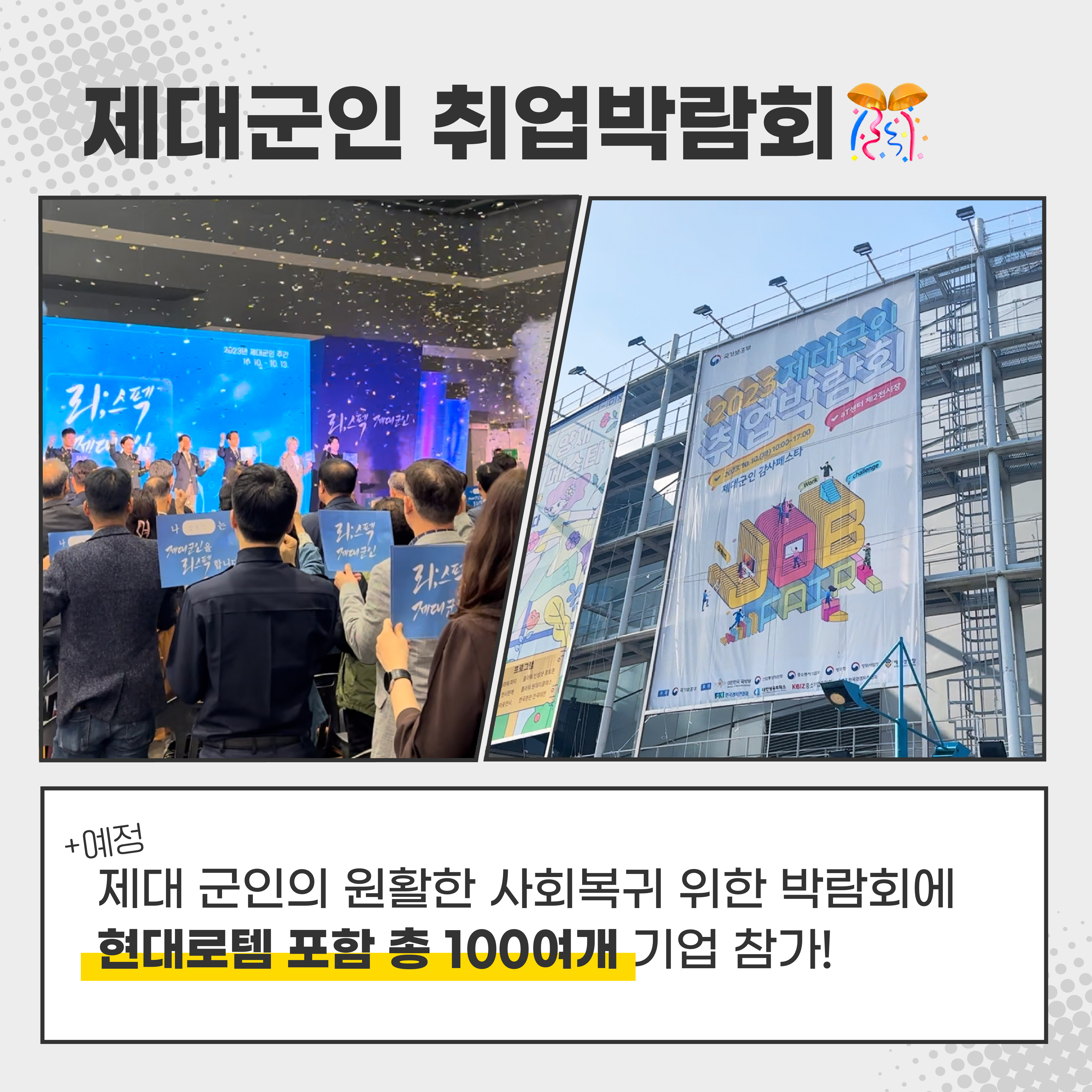국가보훈부는 제대(예정) 군인의 원활한 사회복귀를 지원하기 위해 이번 행사를 진행했어요. 현대로템을 포함해 총 100여개의 기업이 참가해 제대군인을 위한 상담과 채용을 마련했는데요. 2019년에 열린 국가보훈 일자리 박람회보다 참가기업 수가 88%나 증가해 제대군인의 많은 관심을 받았습니다.
