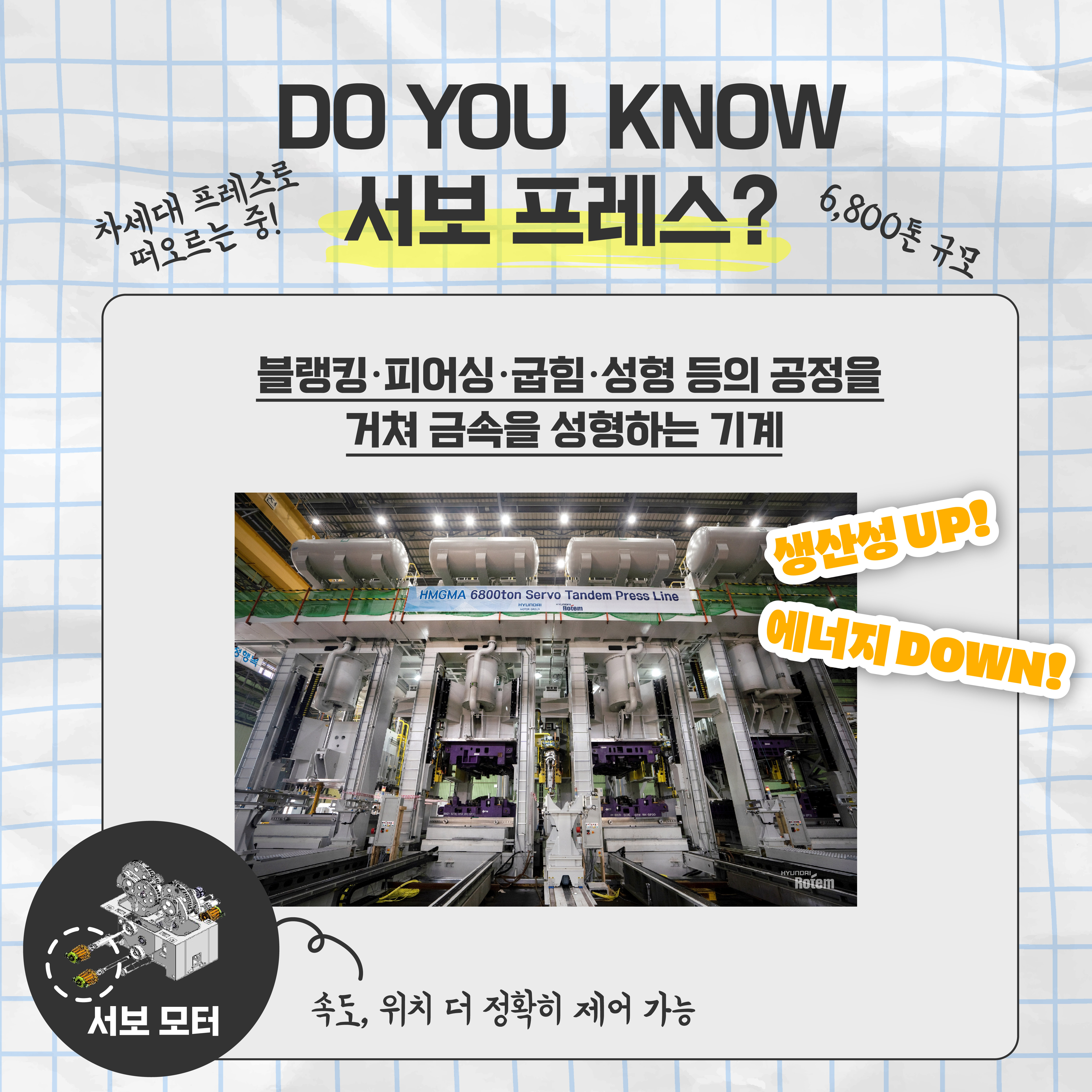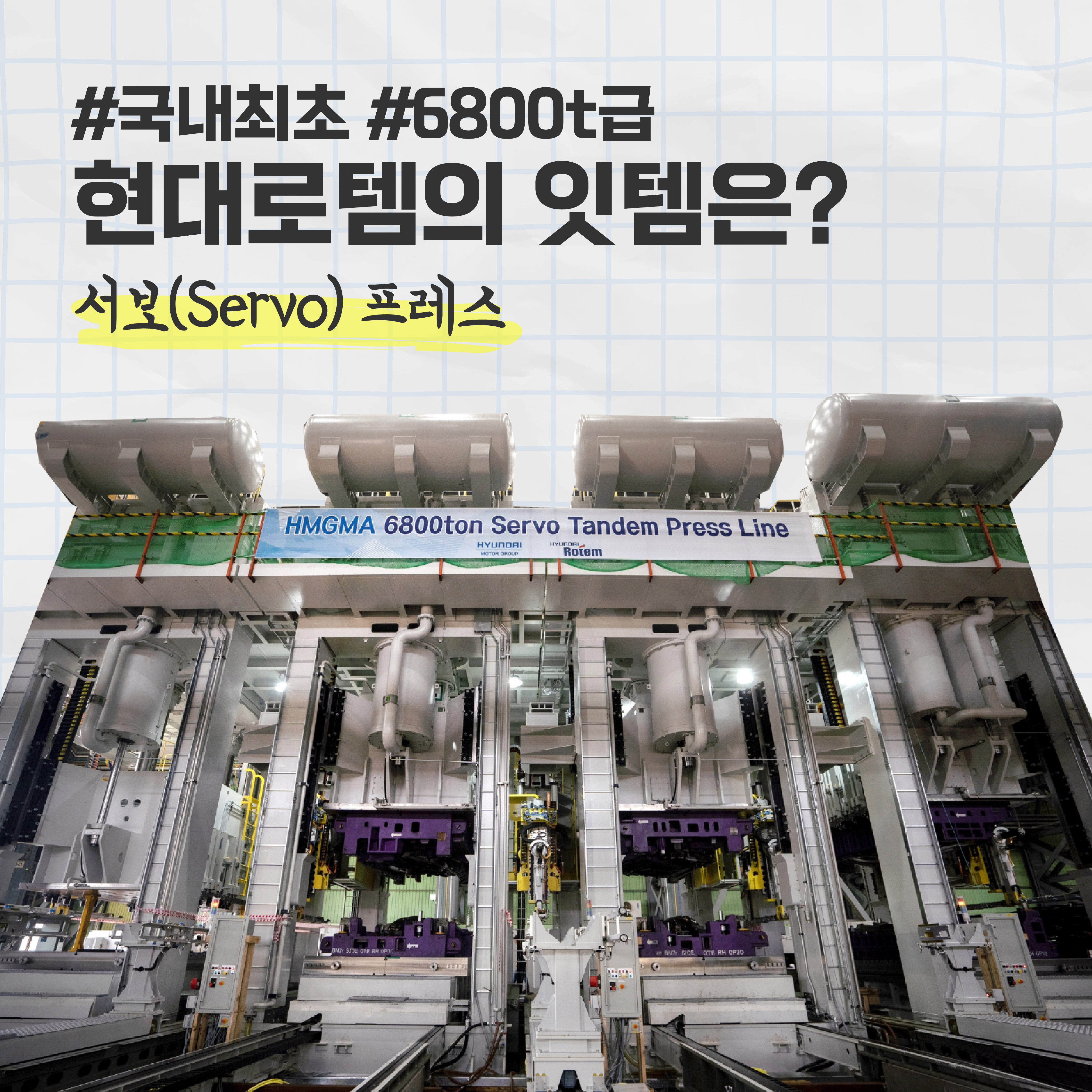 오늘은 현대로템이 국내 업체 최초로 달성한 것을 하나 소개할게요. 바로 서보(Servo) 프레스 국산화 기술을 확보한 것인데요. 현대로템은 에코플랜트 부문에서 2008년 서보 프레스 개발에 착수하고 2009년 핵심 제어 기술을 개발했습니다. 이어 2012년 국내 최초로 국산화 기술 확보에 성공했으며 2023년 8월 6800t급의 초대형 서보 프레스 설비 실물을 최초 공개했습니다.