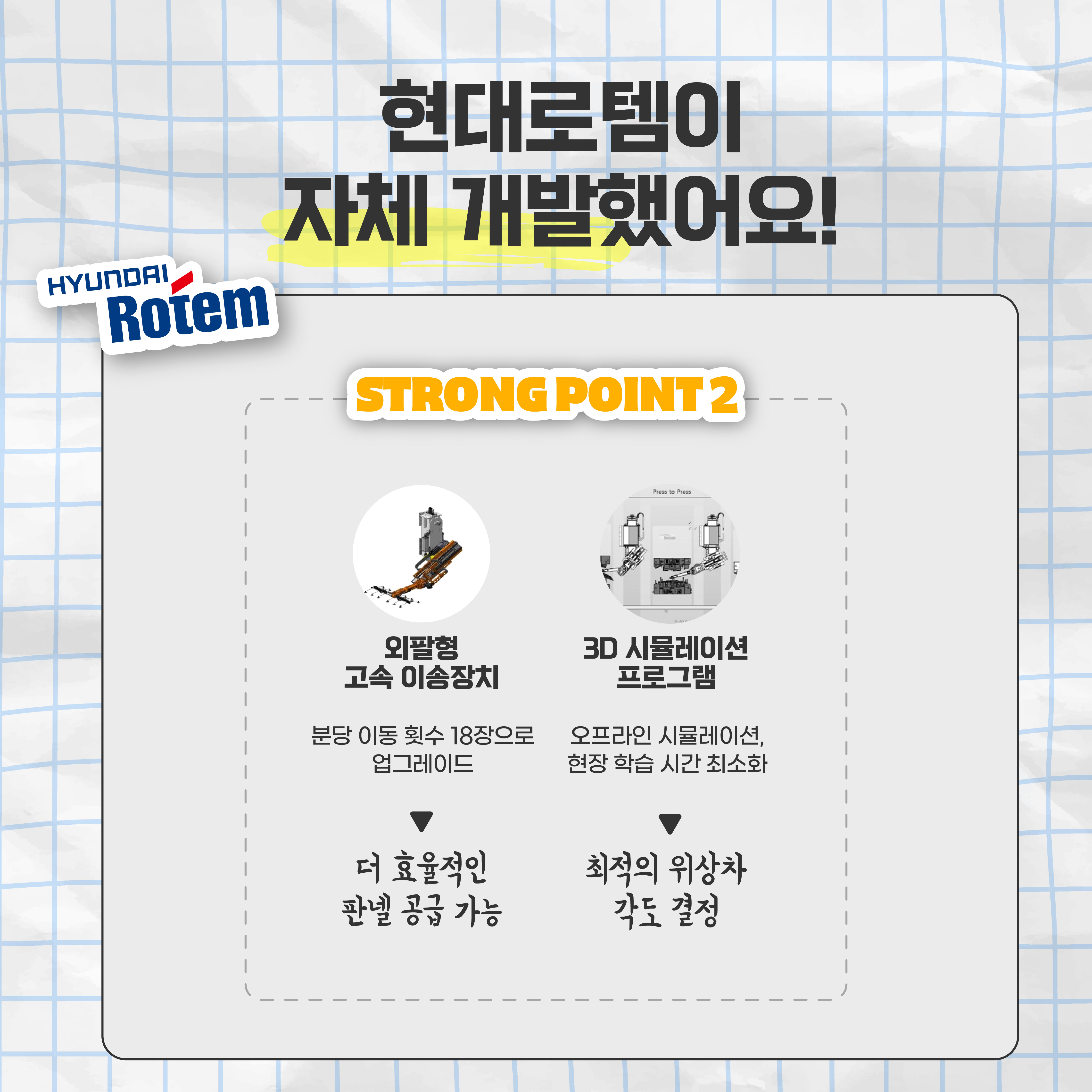 여기에 현대로템이 자체 개발한 외팔형 고속 이송장치(SHIFT)와 3D 시뮬레이션 프로그램(HRMS: (HRMS: Hyundai-Rotem 3D Motion Simulator)로 생산성을 극대화했는데요. 기존 탠덤 프레스에 사용되던 해외 장치의 분당 이동 횟수(SPM: Stroke Per Minute)가 15장(spm)이었다면, 현대로템 제품은 같은 시간에 18장(spm)으로 더 많은 판넬을 이송할 수 있습니다. 이로써 자동차 생산설비시장에서 더 효율적인 판넬 공급이 가능해진 것을 입증한 것이죠.