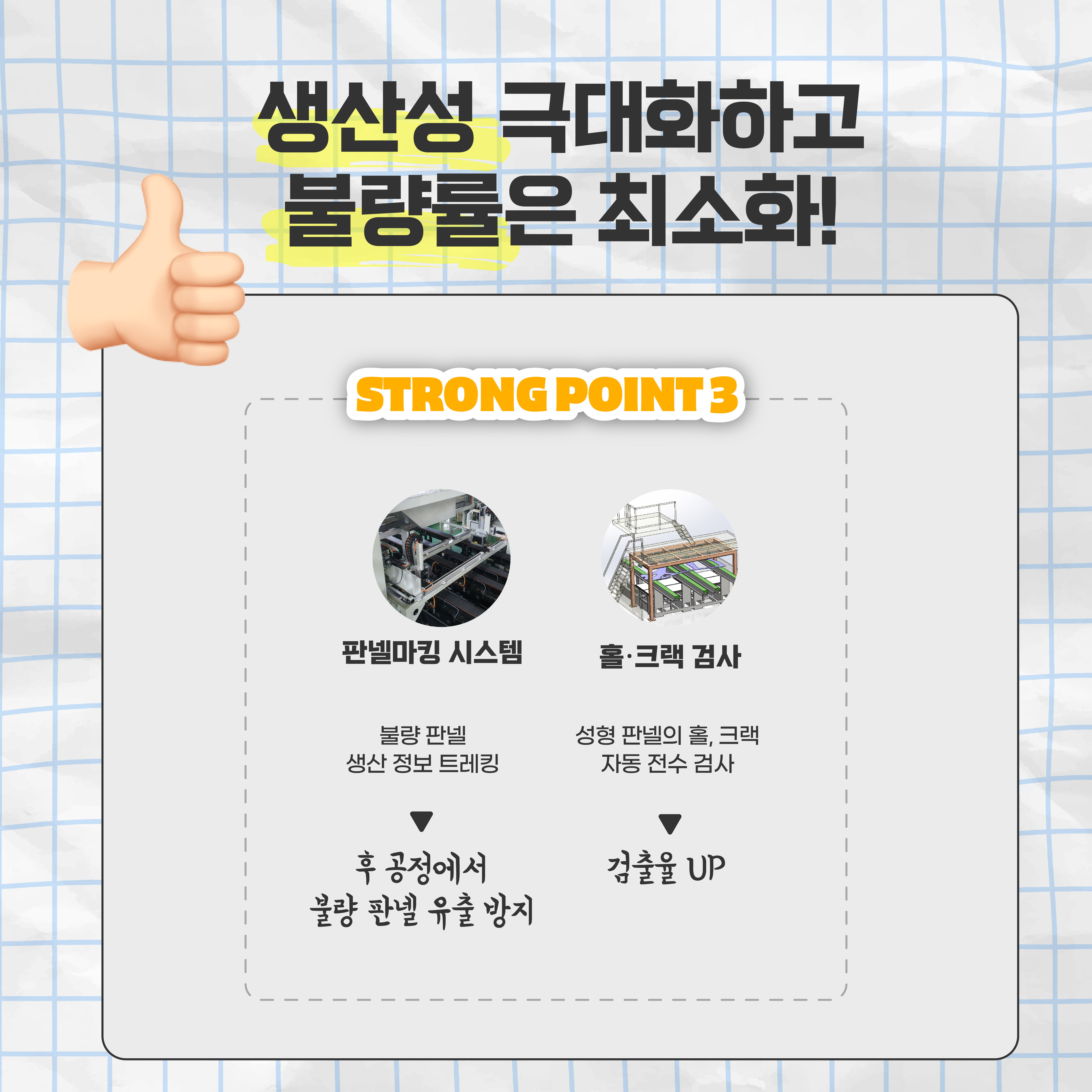 더불어 온라인 홀∙크랙 자동 감지 시스템으로 모든 성형 판넬의 홀(Hole) 수량과 크랙(Crack)을 자동 전수 검사하여 후 공정으로 유출되는 부품이 없도록 관리합니다. 자동 검사 장치는 하드웨어(H/W: HardWare) 제어와 딥러닝 알고리즘을 개발, 적용해 홀과 크랙의 검출율을 향상시키기도 했습니다.