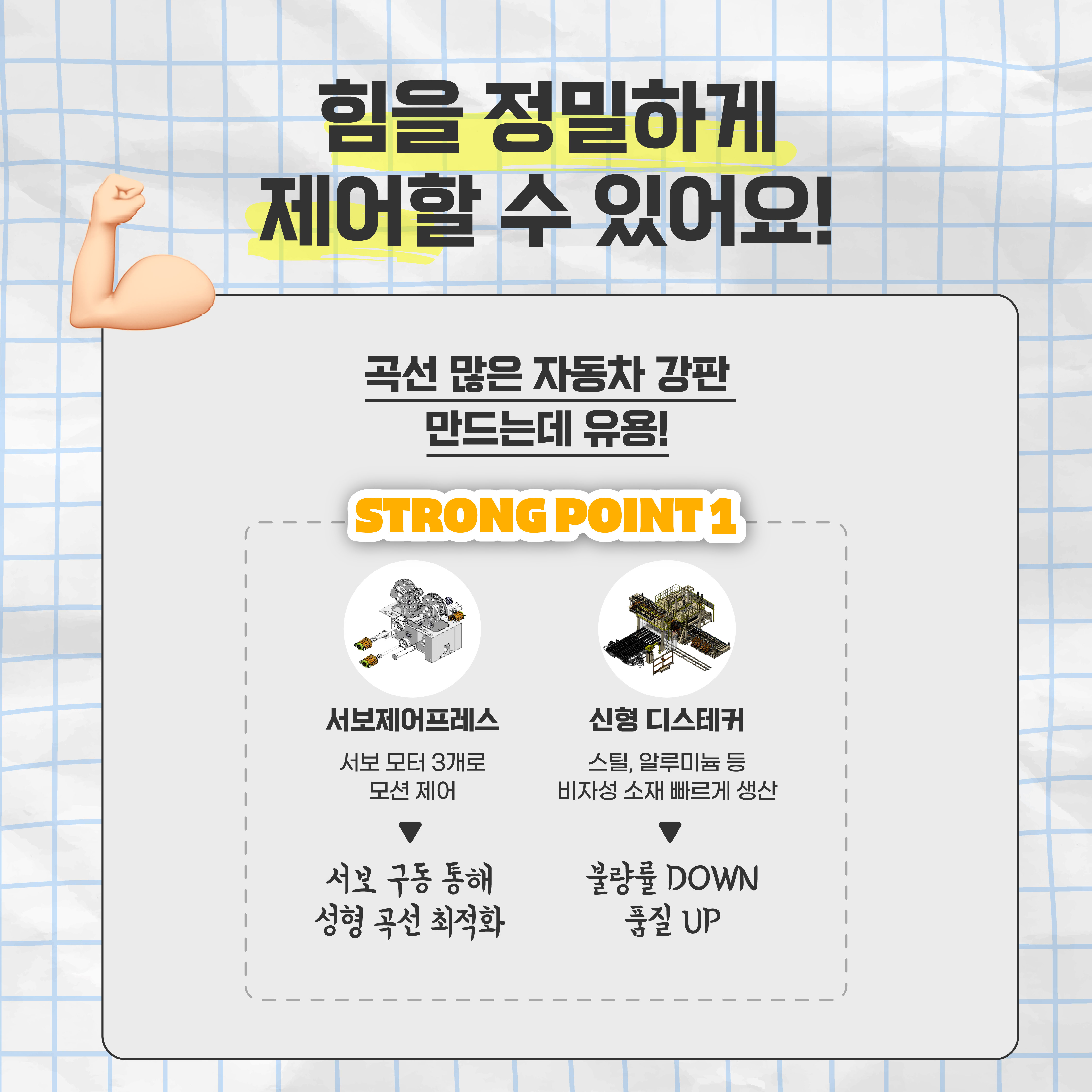 이 같은 장점 덕분에 서보 프레스는 곡선이 많은 자동차의 외부 차체를 이루는 강판을 찍어내는 데 유용합니다.