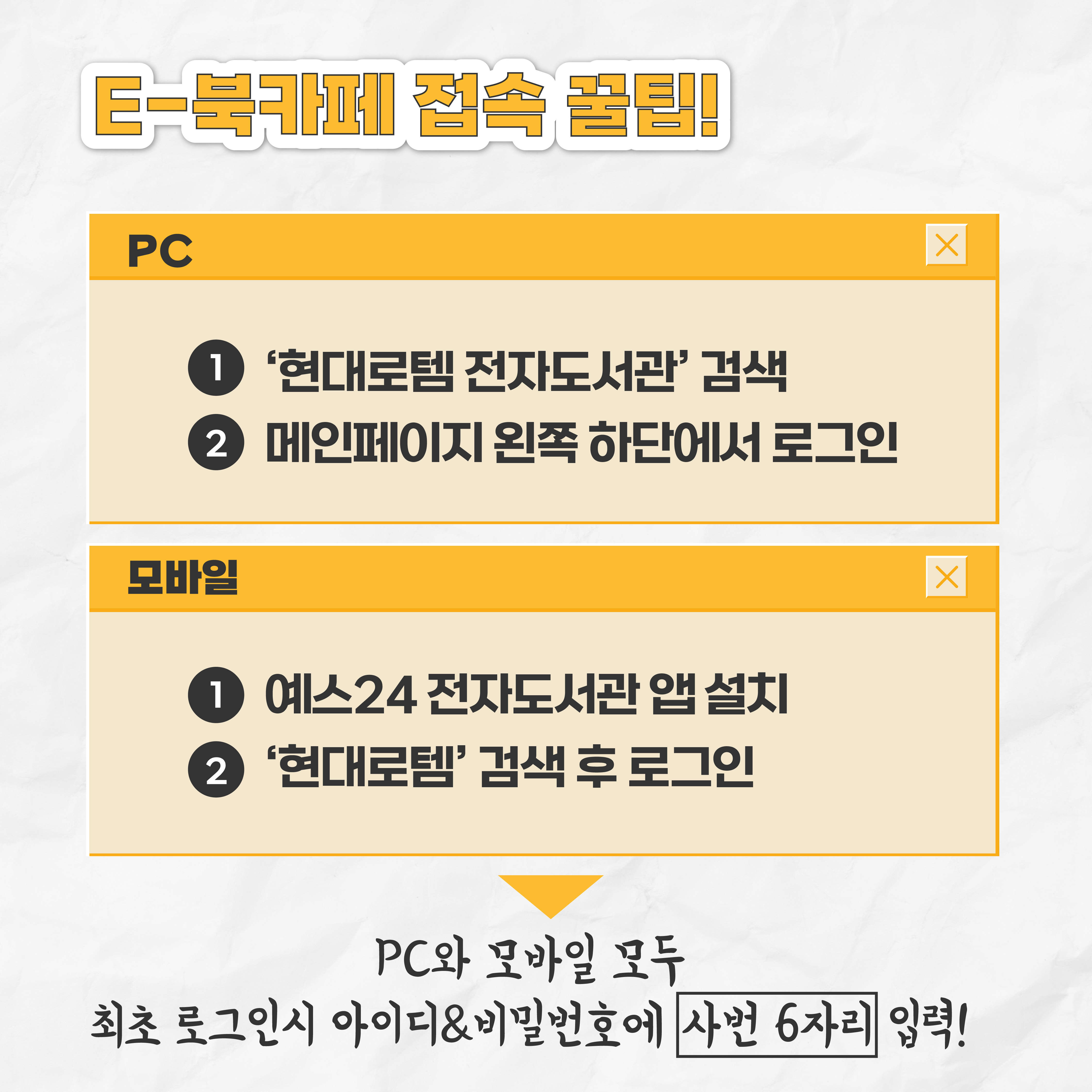 PC의 경우 인터넷 검색창에 ‘현대로템 전자도서관’ 검색 후 메인페이지로 접속해 주세요. 그리고 왼쪽 하단에 있는 로그인 창을 이용하면 됩니다. 최초 로그인 시에는 아이디와 비밀번호 모두 사번 6자리를 입력해 사용하면 돼요.