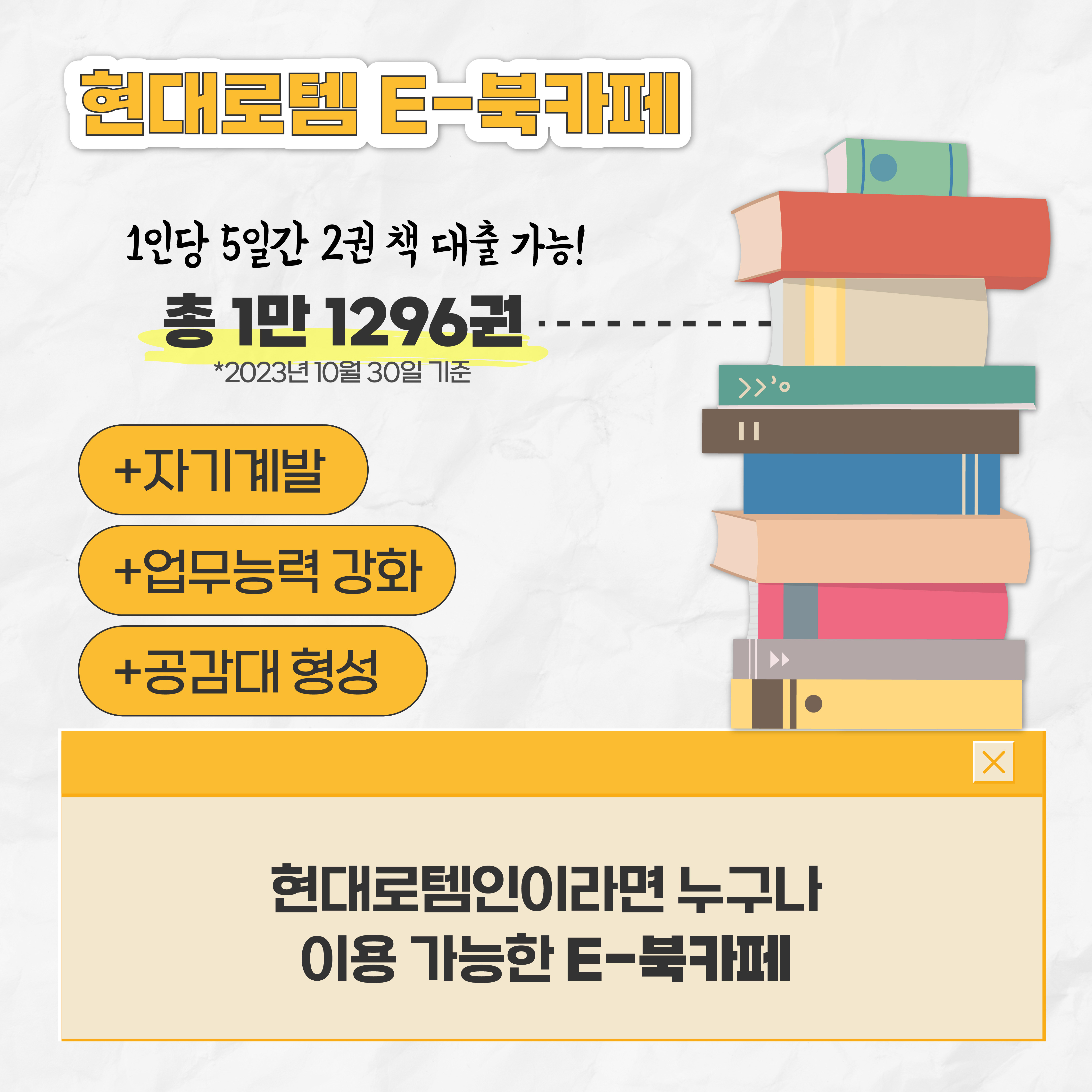 현대로템 E-북카페는 2024년부터 업데이트를 연 6회로 늘려 임직원 맞춤형 북카페를 만들어 나갈 예정이니 많이 기대해주세요!