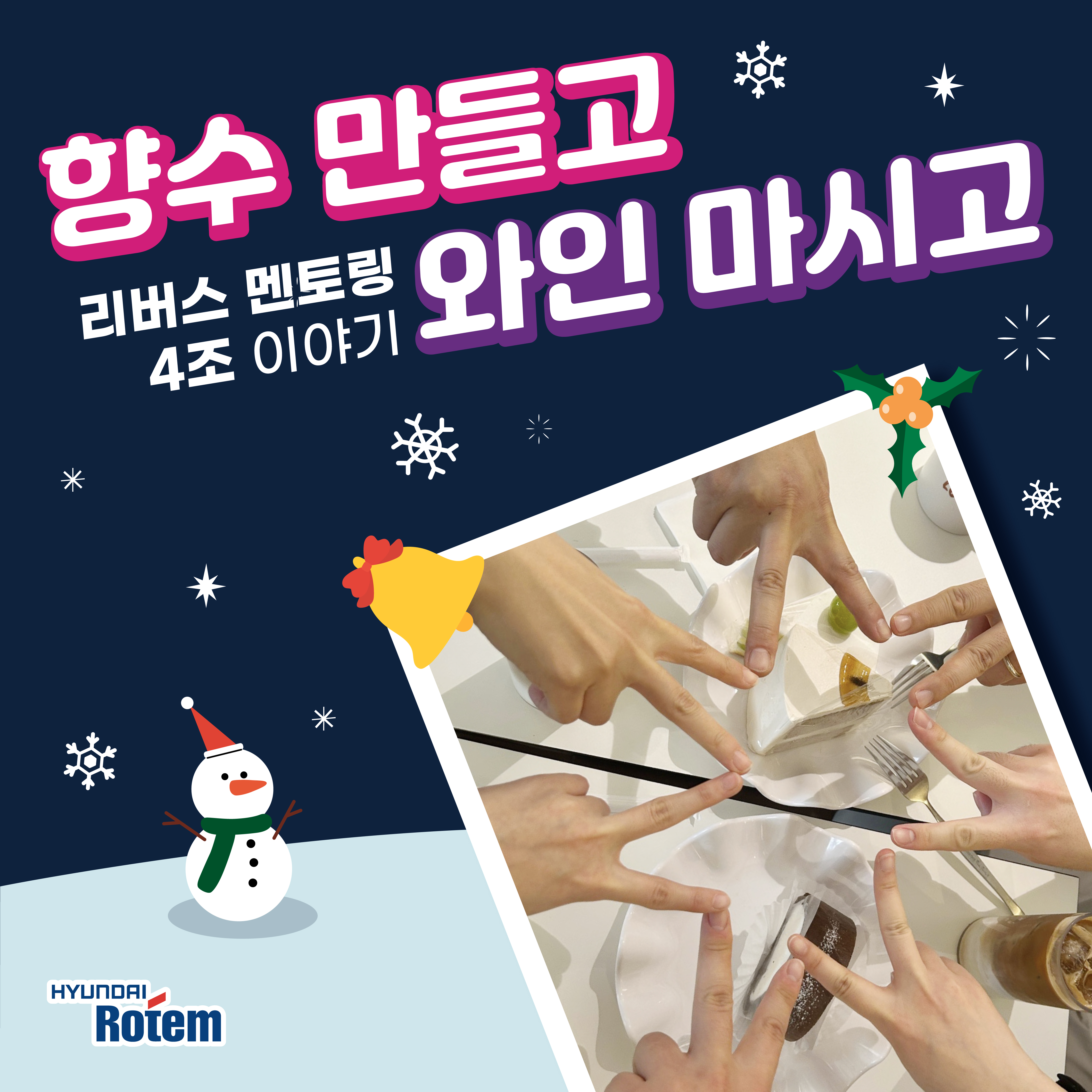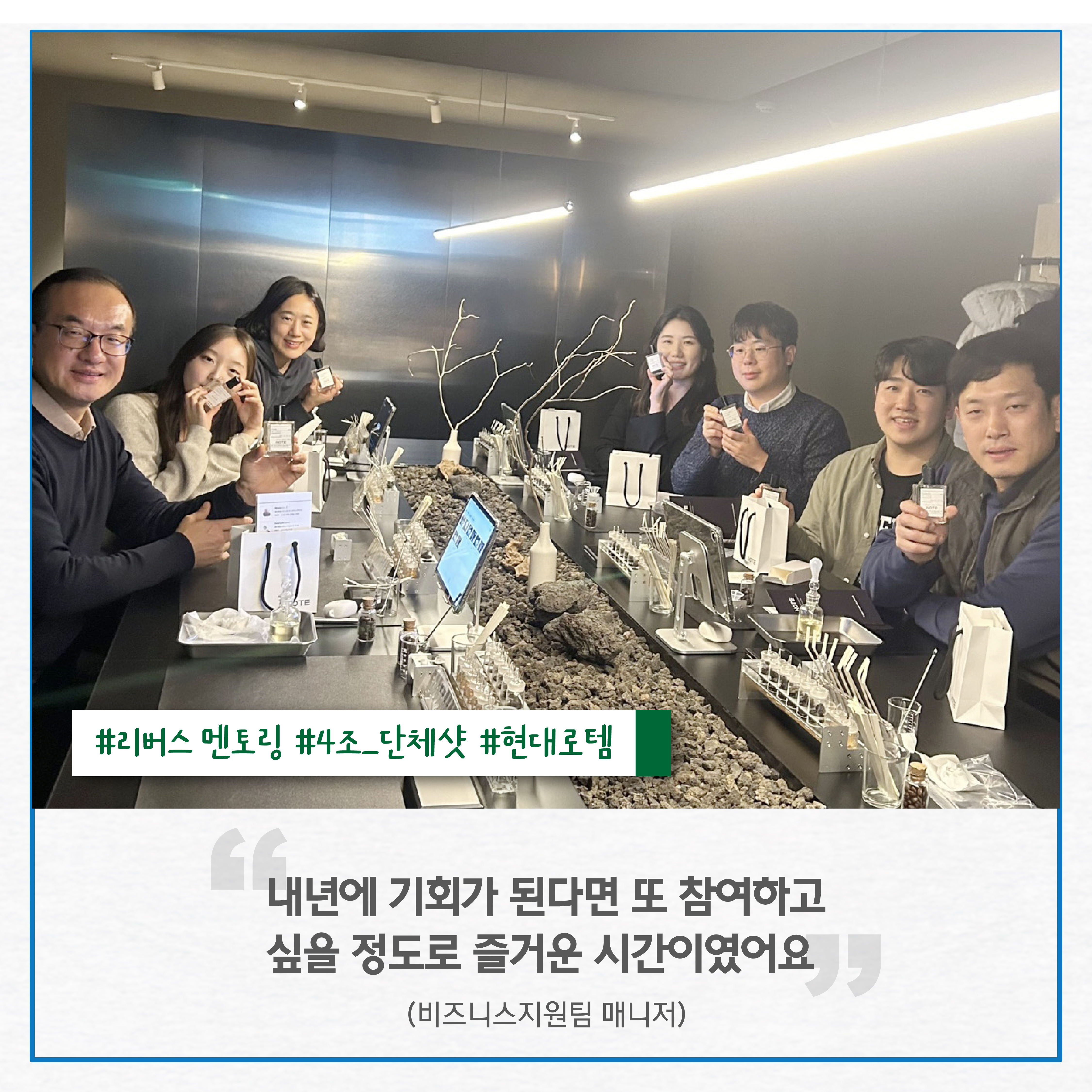 이날 리버스 멘토링에 참여한 비즈니스지원팀 박성훈 매니저는 “내년에 기회가 된다면 또 참여하고 싶을 정도로 즐거운 시간이었다”며 “앞으로도 4조에서 만난 동료들과 계속 친하게 지내고 싶다”고 후기를 들려주기도 했답니다. 현대로템의 리버스 멘토링 이야기는 내년에도 계속 이어집니다. 많이 기대해주세요.