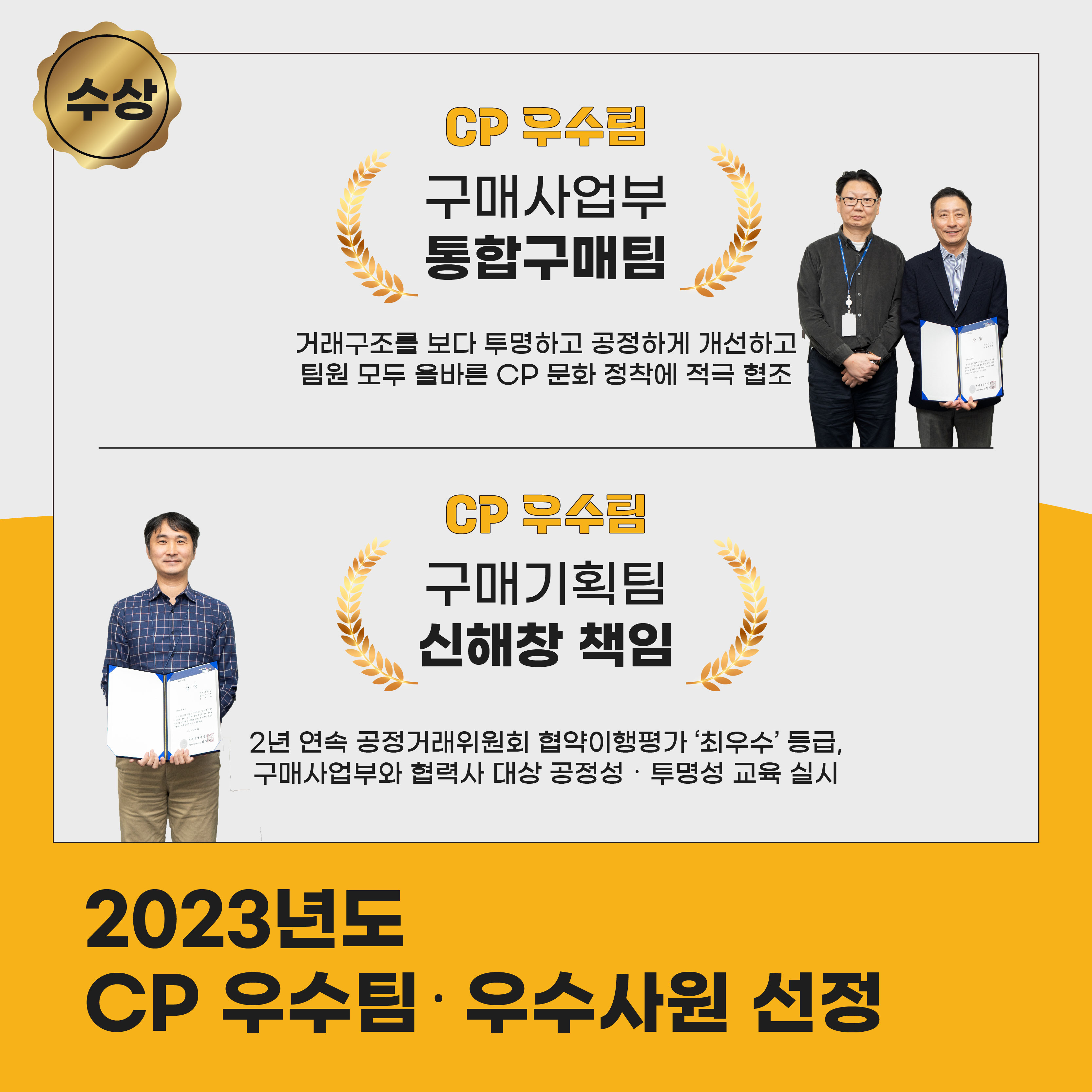 또 9월에는 2023년도 CP 우수팀∙사원을 선정하기도 했어요. 구매사업부 ‘통합구매팀’에게 우수팀의 영광이 돌아갔는데요. 통합구매팀은 거래구조를 보다 투명하고 공정하게 개선하고 팀원 모두 올바른 CP 문화 정착에 적극 협조해 좋은 결과를 얻게 됐습니다.