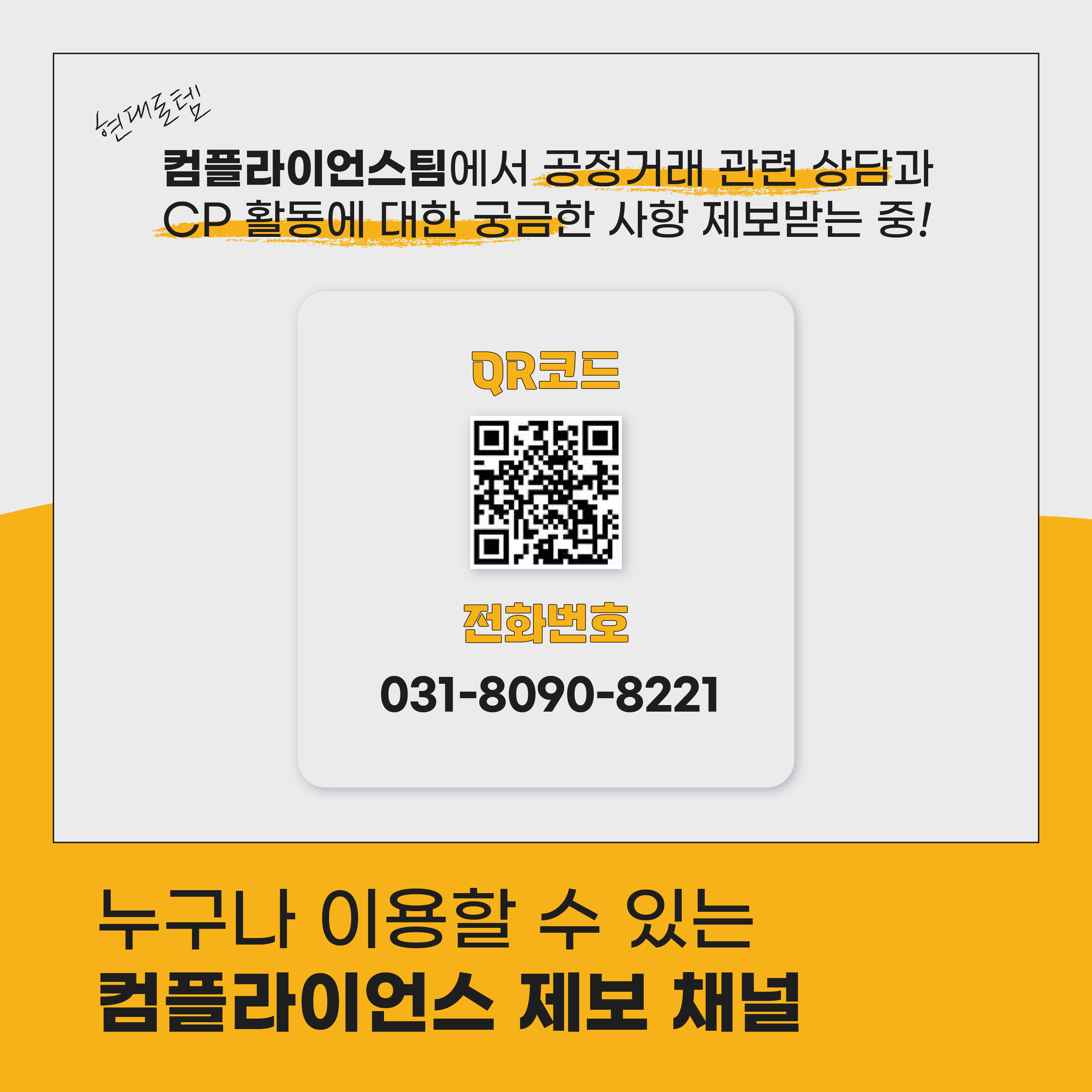 현대로템 공정거래 업무를 총괄하고 있는 컴플라이언스팀에서는 실무상 발생할 수 있는 공정거래 관련 상담과 CP 활동에 대한 궁금한 사항을 유선(031-8090-8221)이나 QR 코드로 받고 있는데요. QR코드로 접속하면 현대로템 컴플라이언스 제보채널로 연결돼 누구나 상시로 이용할 수 있습니다.