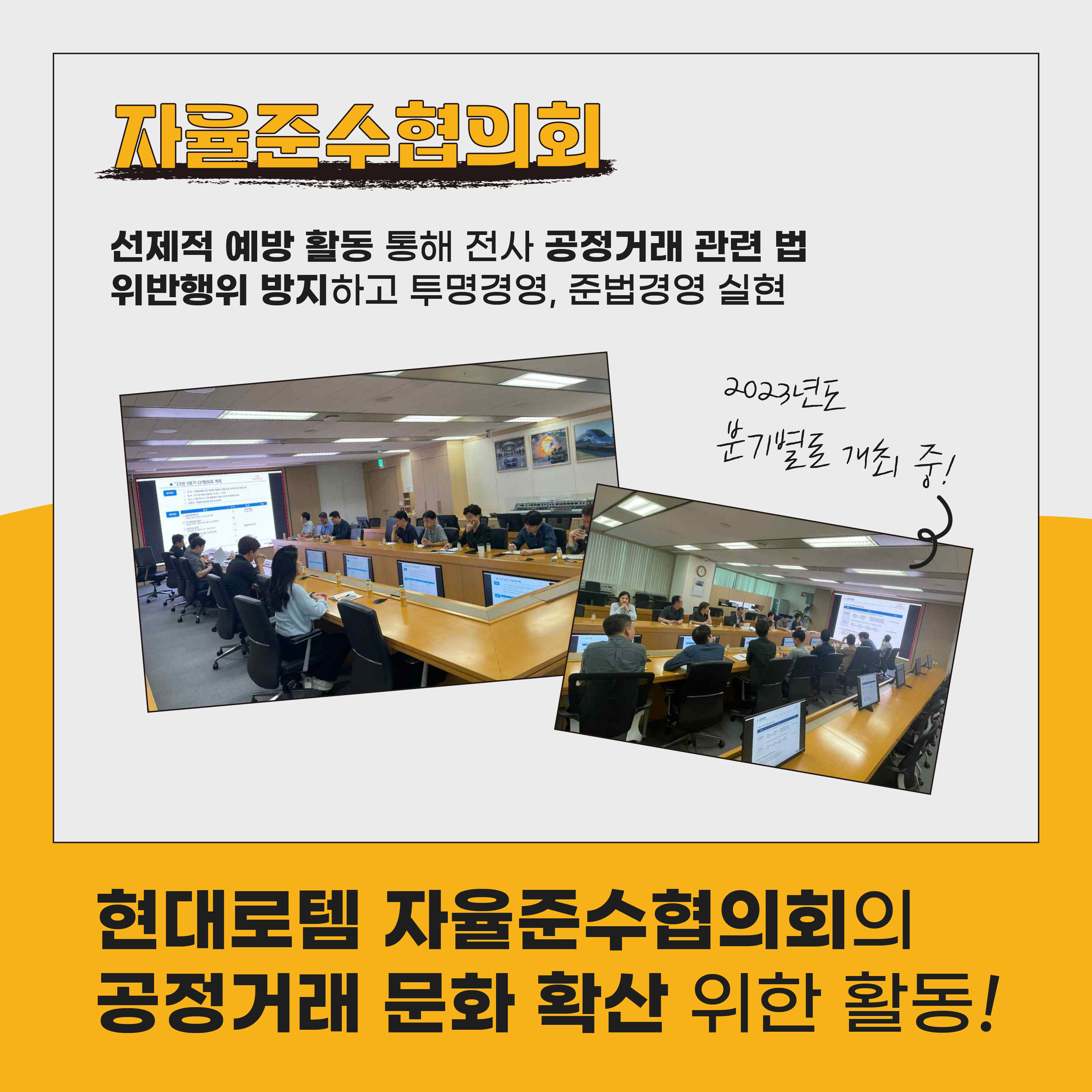 현대로템은 2023년 각 분기마다 부문별 자율준수 활동을 점검하고 공정거래 동향을 공유하고자 자율준수협의회 활동을 수행하고 있는데요.
