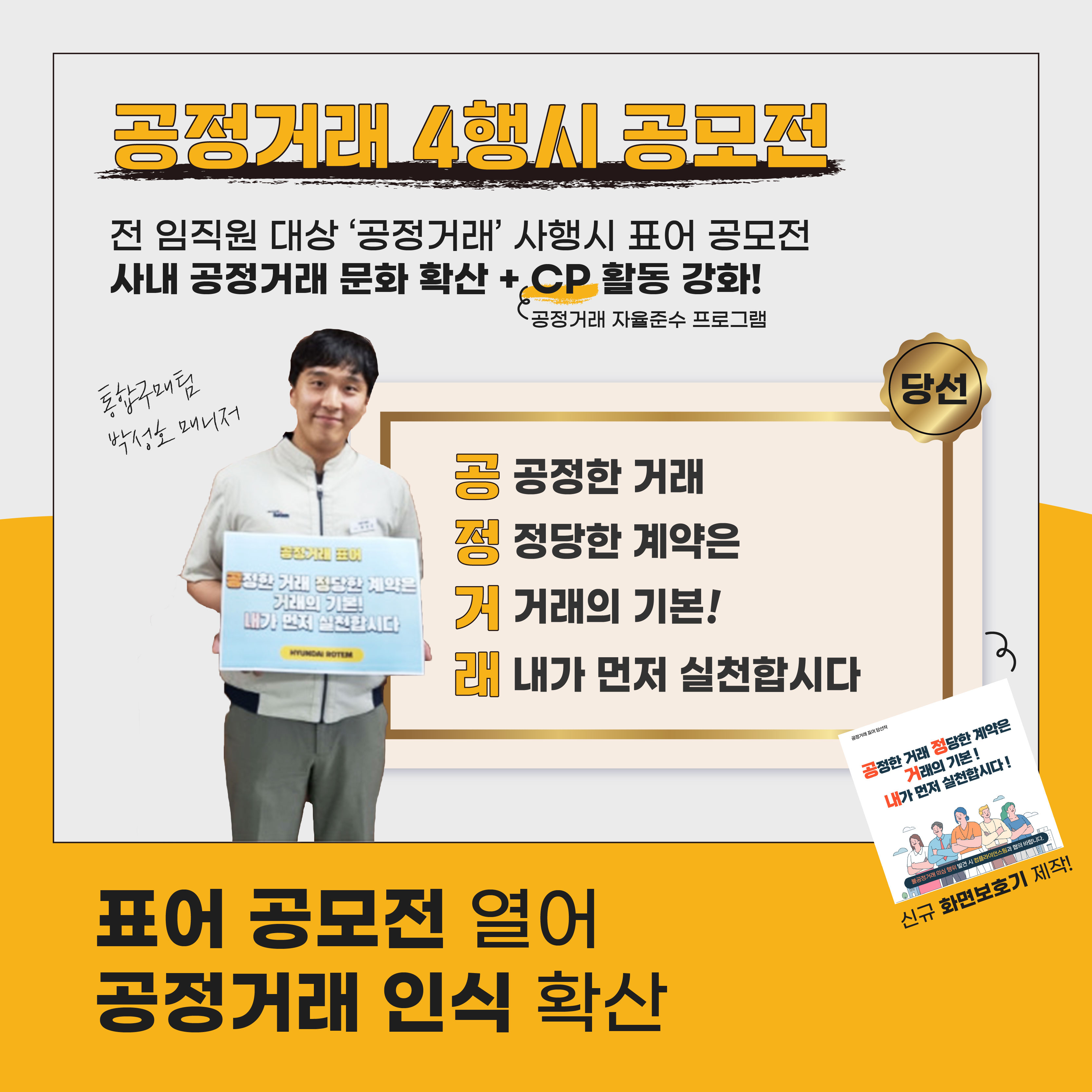 첫 번째는 표어 공모전입니다. 사내 공정거래 문화를 확산하고자 지난 6월 전 임직원을 대상으로 ‘공정거래’ 사행시 형식의 표어 공모전을 진행했습니다. 최종 당선작은 신규 화면보호기로 제작하여 임직원들이 자주 볼 수 있도록 했어요.
