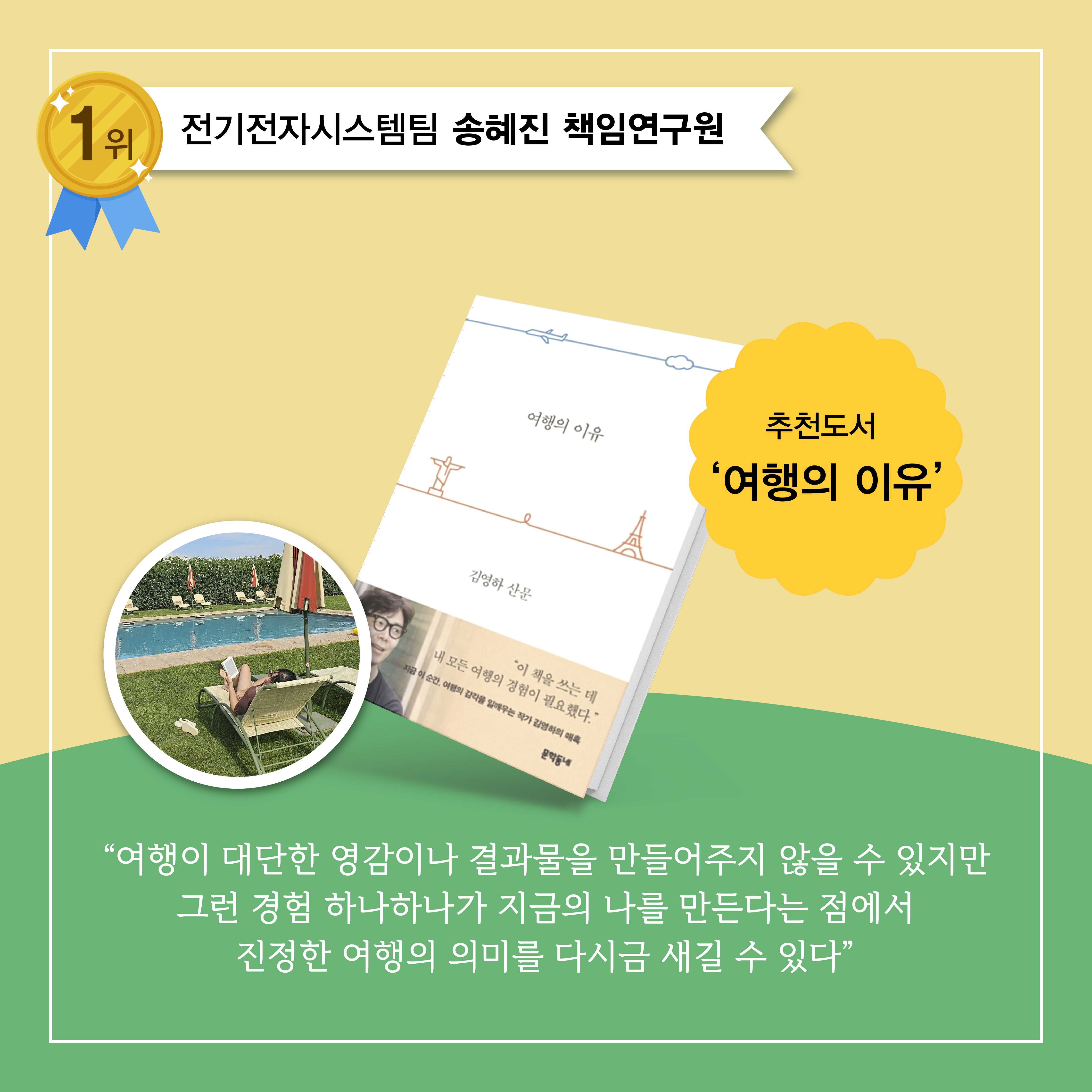 영광의 1위는 바로 전기전자시스템팀 송혜진 책임연구원이 차지했어요. 송 연구원은 추천 도서로 김영하 작가의 ‘여행의 이유’를 꼽았는데요. “여행이 대단한 영감이나 결과물을 만들어주진 않지만, 그런 경험들이 있기에 지금의 내가 있을 수 있었다”고 전했어요. 여행의 의미를 다시금 새길 수 있는 책으로 ‘여행의 이유’를 추천했습니다.