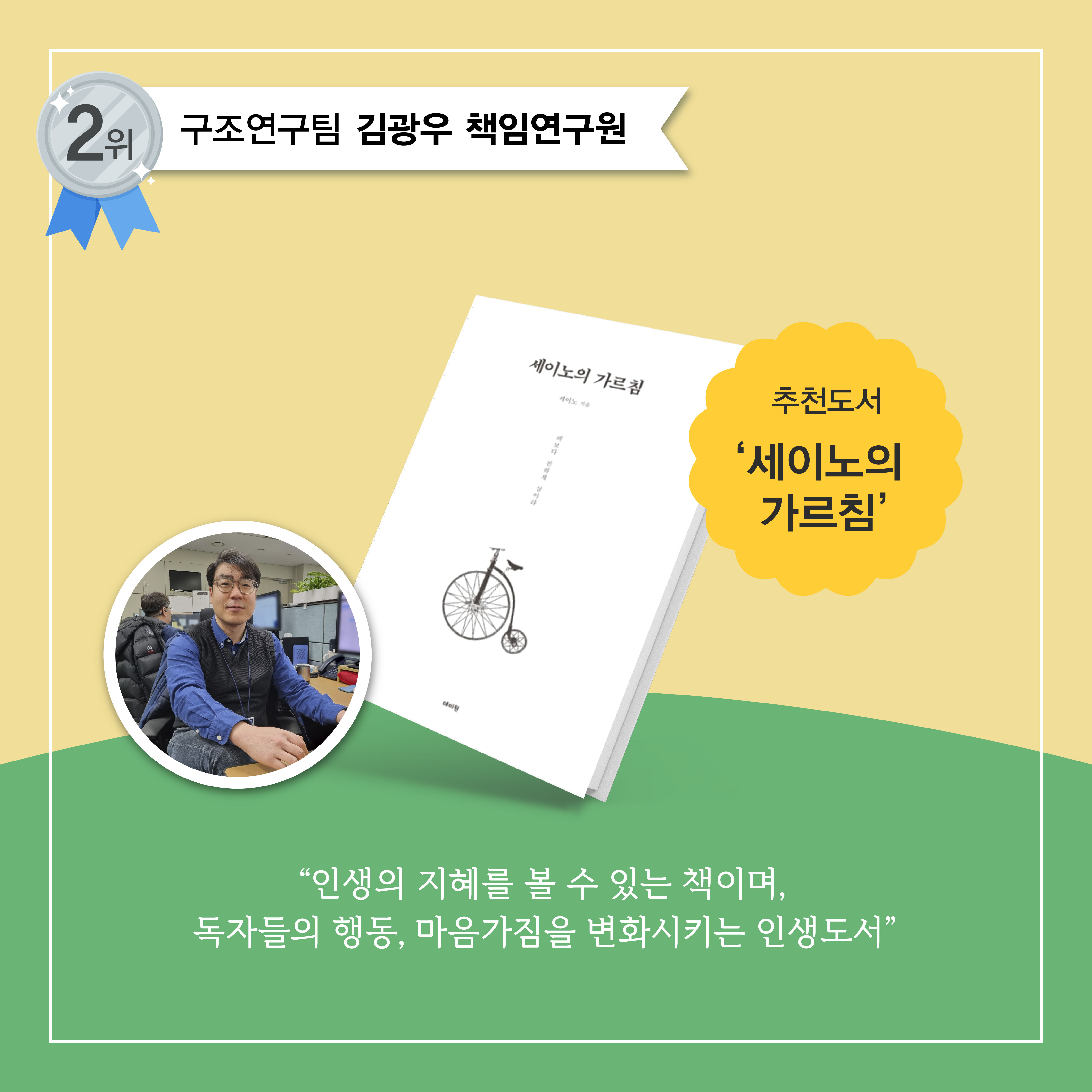 다독왕 2위는 구조연구팀 김광우 책임연구원 입니다. 저자 세이노가 쓴 ‘세이노의 가르침’을 추천도서로 꼽은 김 연구원은 “인생의 지혜를 볼 수 있다”며 “책 속에서 저자가 벽력같이 일갈하지만 독자들의 행동, 마음가짐을 변화시키는 인생도서”라고 언급했는데요. 삶을 어떻게 살아갈지 고민이신 분들께 도움이 될 수 있는 책인 것 같아요.