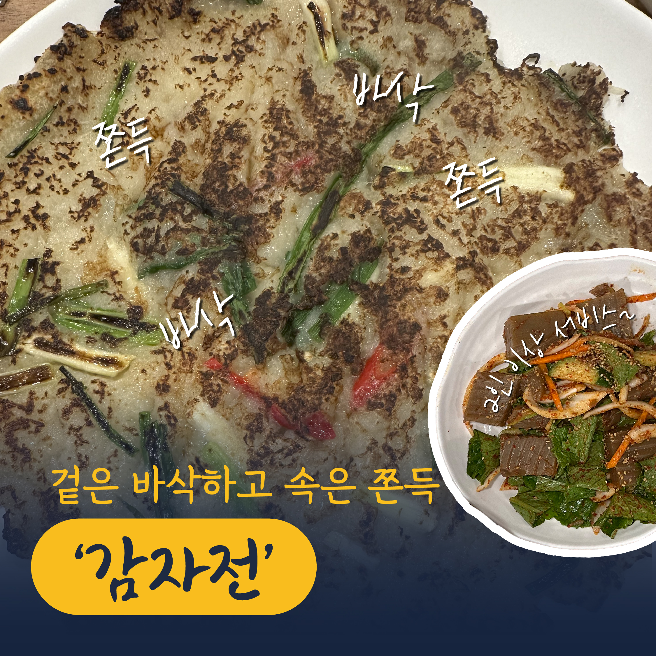 노릇하게 구워진 감자전도 별미 중 하나! 겉은 바삭하고 속은 쫄깃해 씹으면 씹을수록 기분이 좋아지는데요. 감자를 알맞게 갈아 넣어 정말 부드럽고 고소해요. 어른들에겐 술이 술술 들어가는 안주로, 아이에겐 간식으로 즐길 수 있는 건강한 주전부리랍니다.