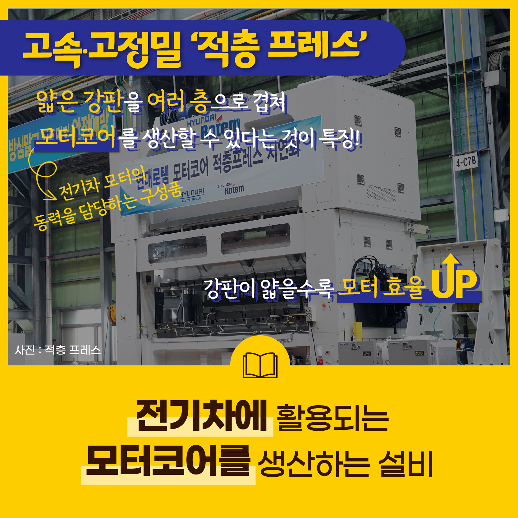 이번에 현대로템이 선보인 프레스는 ‘고속∙고정밀 기계식 프레스’로 전기차에 활용되는 고효율 모터코어를 생산하는 설비예요. 즉 전기차의 심장에 들어가는 핵심 부품을 만드는 것인데요.