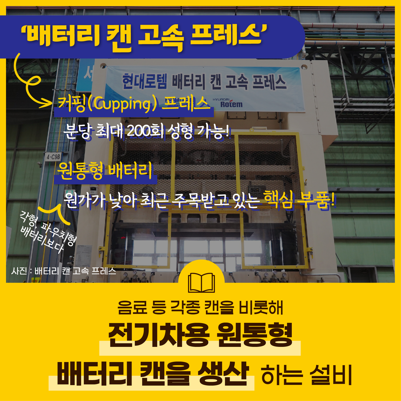 이 외에도 배터리 캔 고속 프레스인 ‘커핑(Cupping) 프레스’도 함께 선보였는데요. 분당 최대 200회 성형이 가능한 이 프레스는 음료 등 각종 캔을 비롯해 전기차용 원통형 배터리 ‘캔’을 생산하는 설비예요.