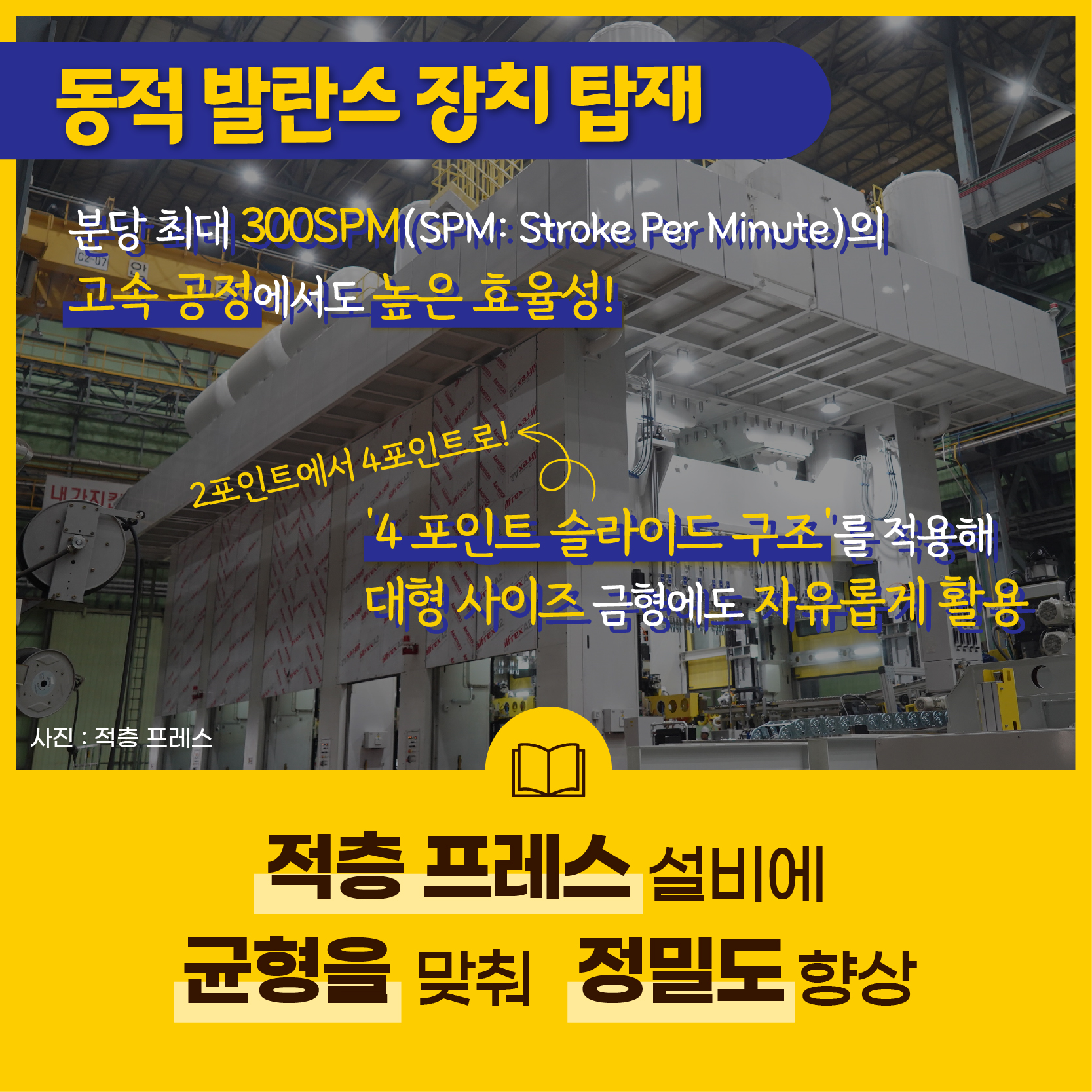 프레임에 진동을 흡수하는 주물 소재를 활용해 설비의 진동도 최소화했는데요. 이 같은 장점으로 효율적인 설비 과정은 물론 높은 품질까지 확보하게 됐어요. 더불어 ‘4 포인트 슬라이드 구조’를 적용해 대형 사이즈 금형에도 자유롭게 활용할 수 있답니다.