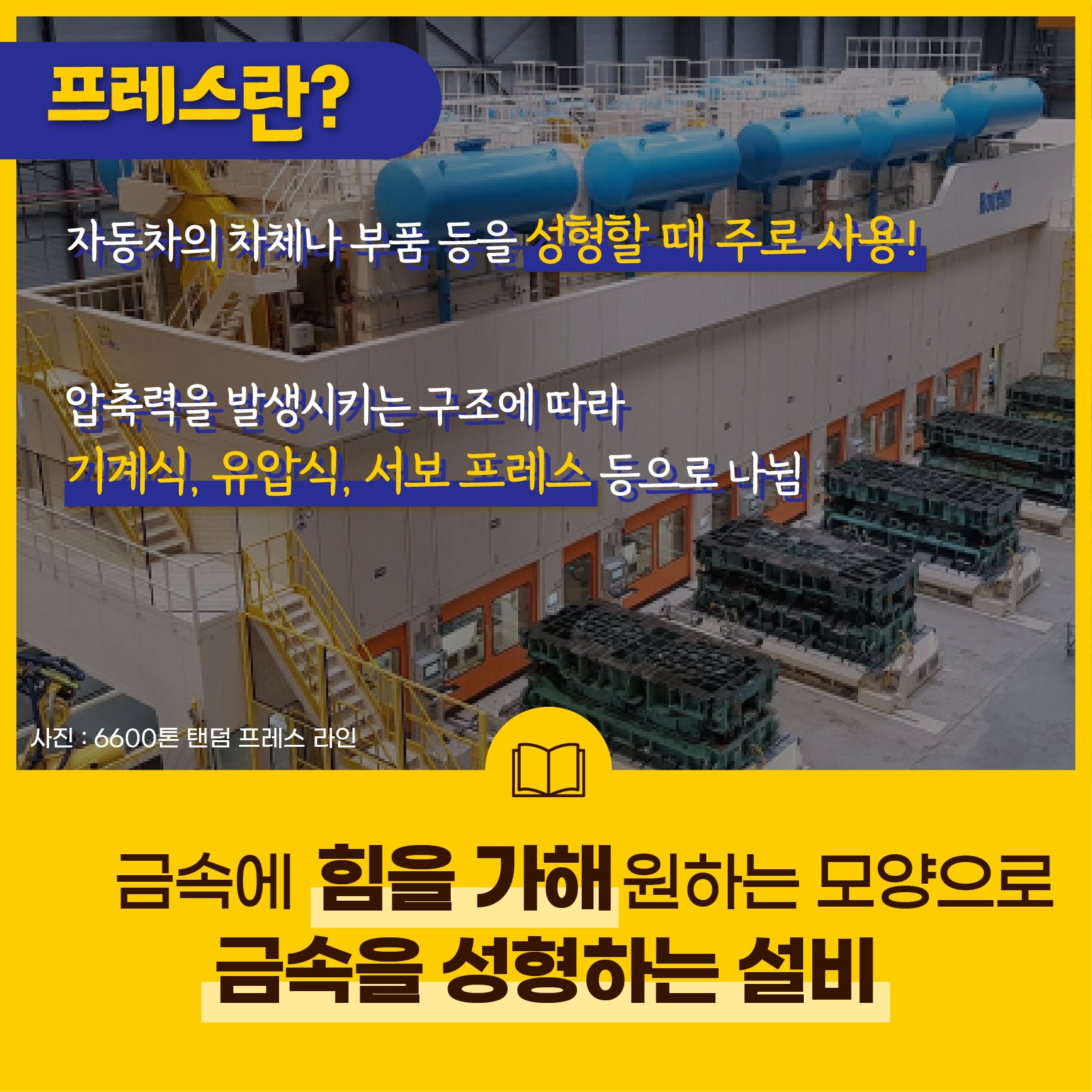 프레스란 금속에 힘을 가해 원하는 모양으로 금속을 성형하는 설비로, 자동차의 차체나 부품 등을 성형할 때 주로 사용해요. 압축력을 발생시키는 구조에 따라 기계식, 유압식, 서보 프레스 등으로 나뉘어요.