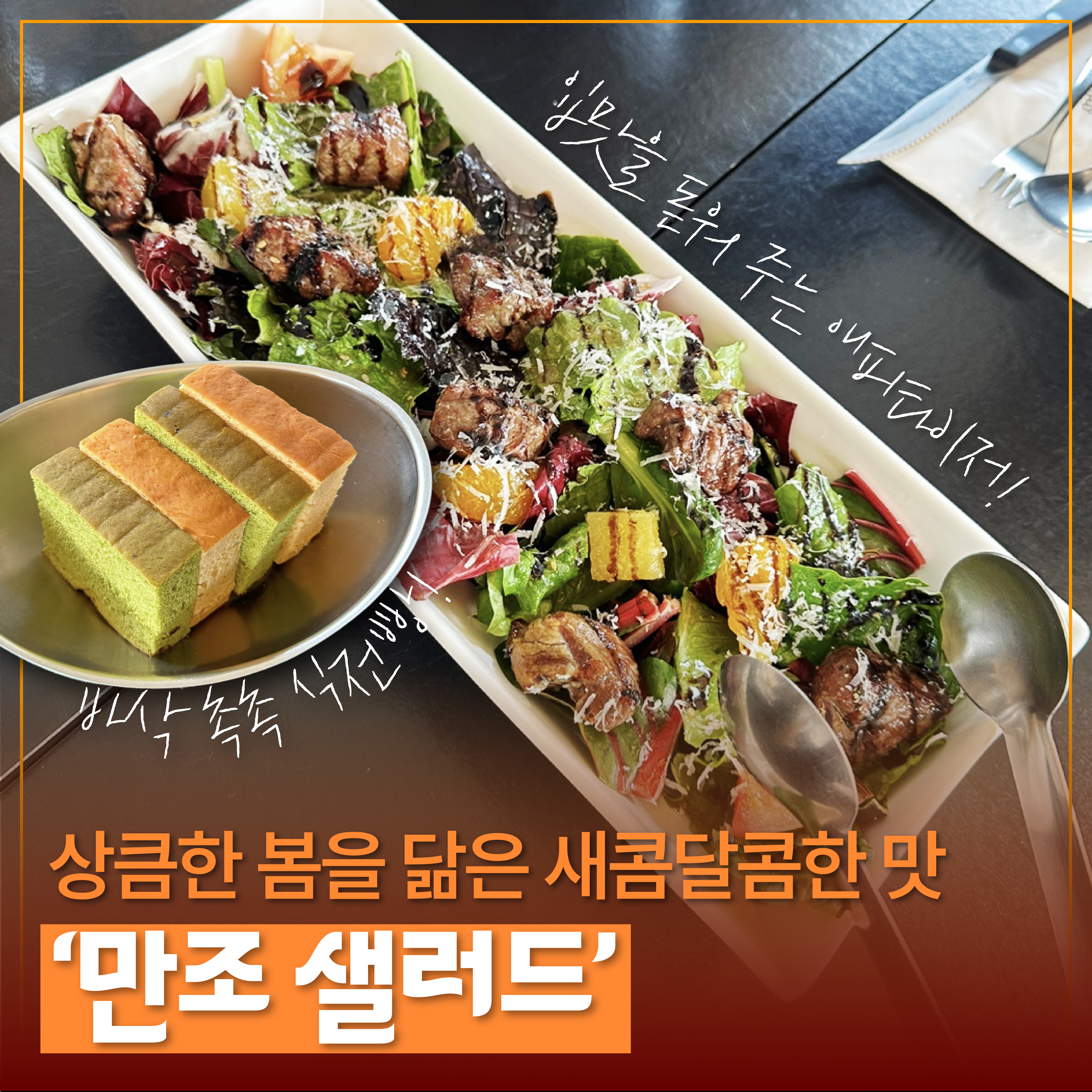 애피타이저 겸 입맛을 상큼하게 만들어줄 ‘만조 샐러드’를 주문했는데요. 드레싱과 채소를 한 입 먹으니 봄을 닮은 듯 새콤달콤함이 입안 가득 퍼졌습니다. 잠자고 있던 미각이 깨어나는 기분이랄까요. 잘 구워진 식전빵을 먹으며 고기와 샐러드를 함께 하니 메인 요리인 파스타가 더 기다려졌어요.