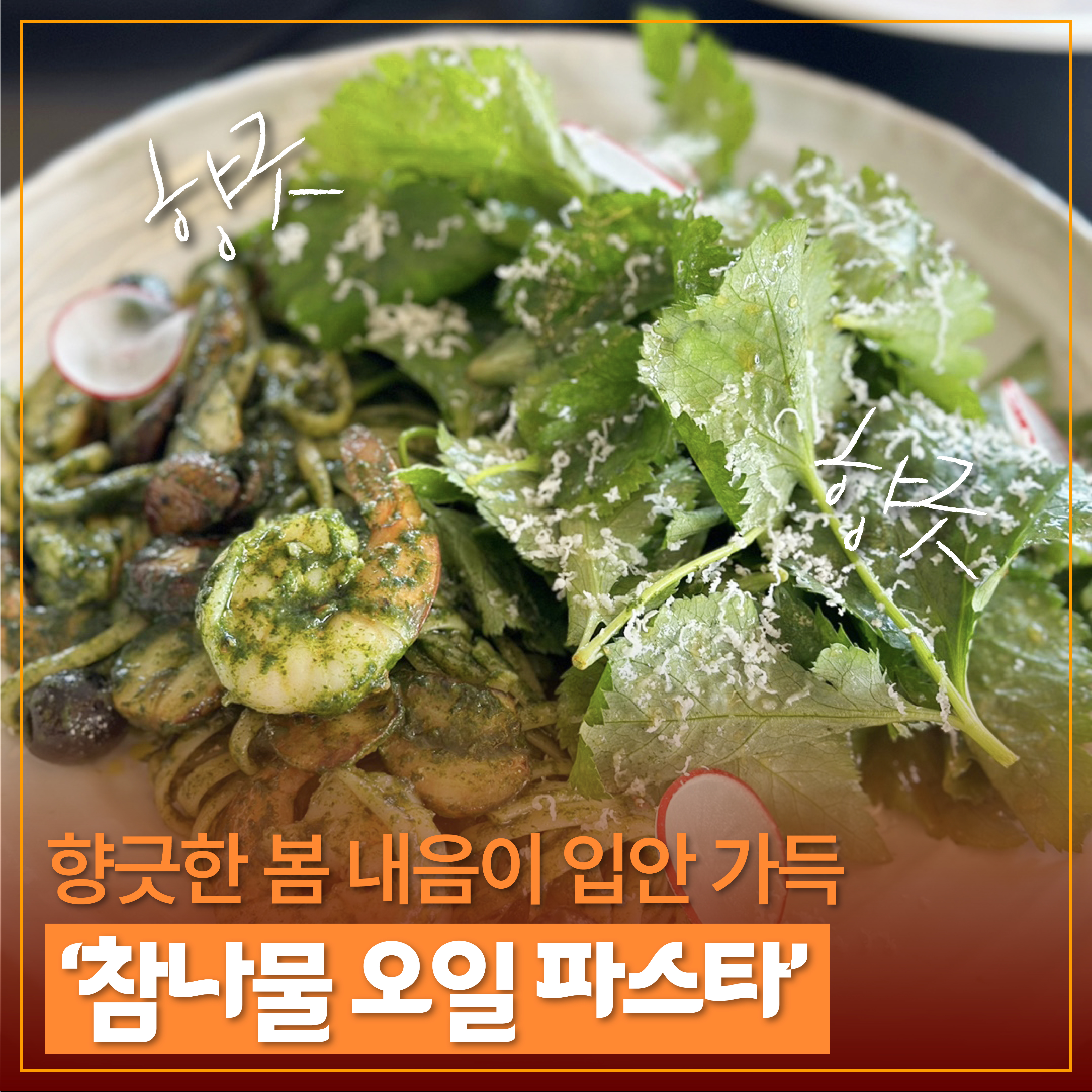 여기에 매력적인 제철 메뉴도 빠질 수 없죠. 특유의 향이 감도는 참나물 오일 파스타도 나물파와 채소파에게 좋은 메뉴인데요. 참나물이 향미를 더해 파스타면이 독특하게 느껴집니다. 우리 나물과 파스타라는 음식이 이렇게 궁합이 잘 맞다는 점이 신선했습니다.