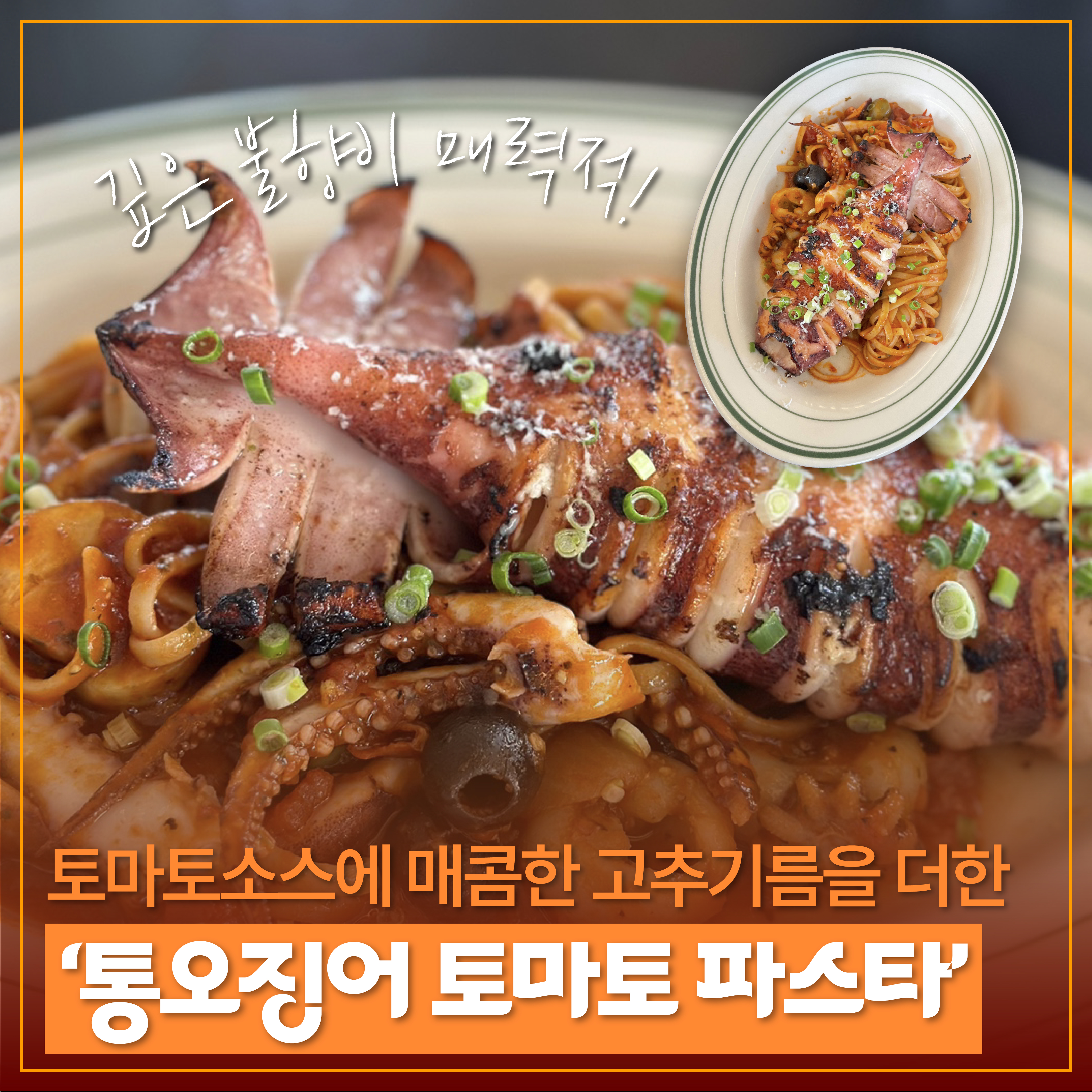 통오징어 토마토 파스타와 참나물 오일 파스타도 일일한정 메뉴예요. 통오징어 토마토 파스타는 토마토 베이스에 매콤한 고추기름이 더해져 물리지 않고 맛있게 먹을 수 있는데요. 깊은 불향과 오징어, 토마토가 만난 맛에 자꾸만 손이 가는 메뉴였어요.