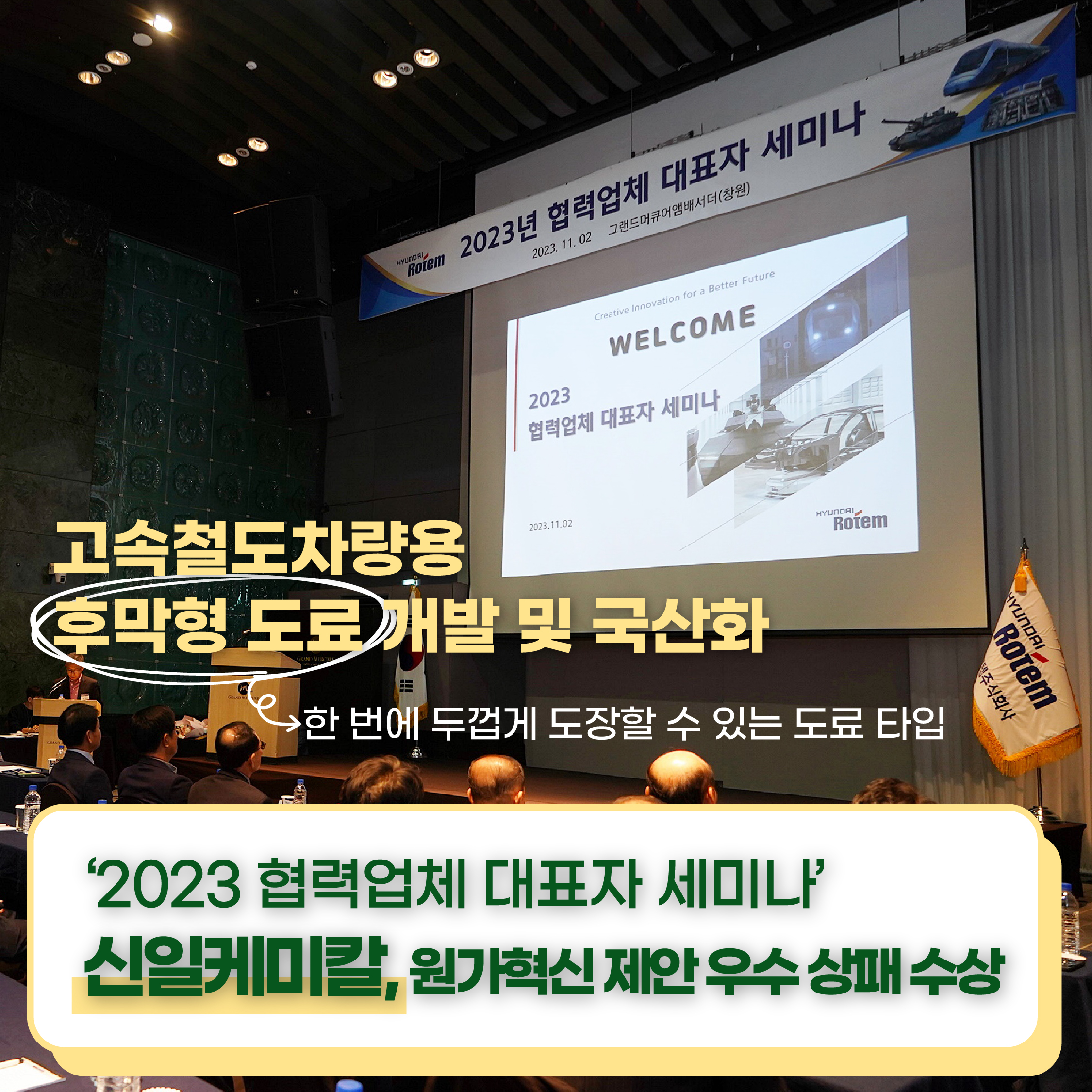 바로 철도차량 부품 제조업체 ‘신일케미칼’입니다. 신일케미칼은 현대로템과 협업하여 고속철도차량 후막형 도료 개발을 국산화하고 고속철도차량 적용시켜 작년 ‘2023 협력업체 대표자 세미나’에서 원가혁신 제안 우수 상패를 받았는데요.