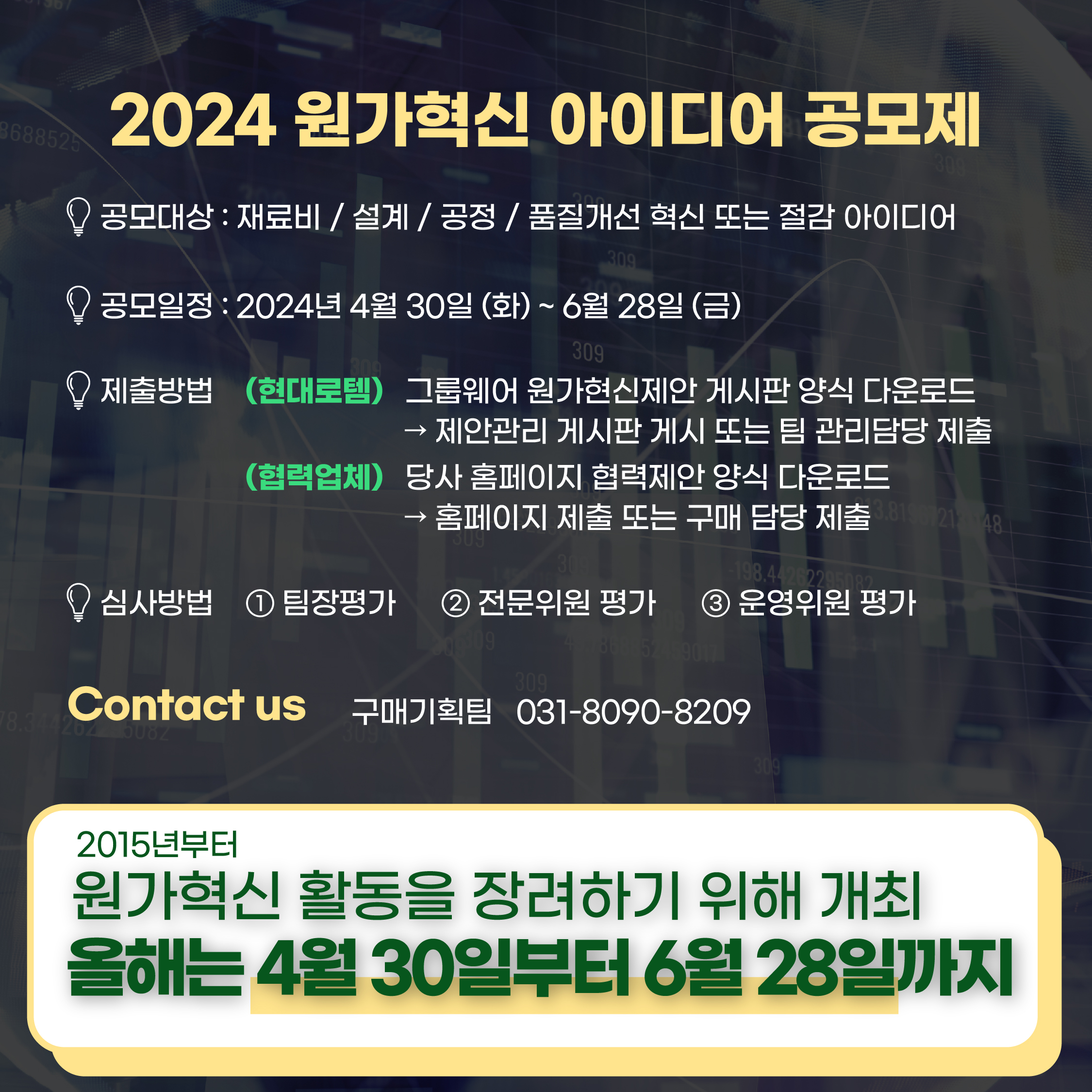 현대로템은 2015년부터 ‘원가혁신 아이디어 공모전’을 개최하고 있습니다. 임직원들과 자사 협력업체의 원가혁신 활동을 장려하고, 다양한 아이디어로 원가 경쟁력을 더 강화하고자 마련됐는데요. 올해는 4월 30일부터 6월 28일까지 진행됩니다. 특히 이번 공모전에는 특별한 리워드와 포상이 더해져 이목을 끌고 있는데요.