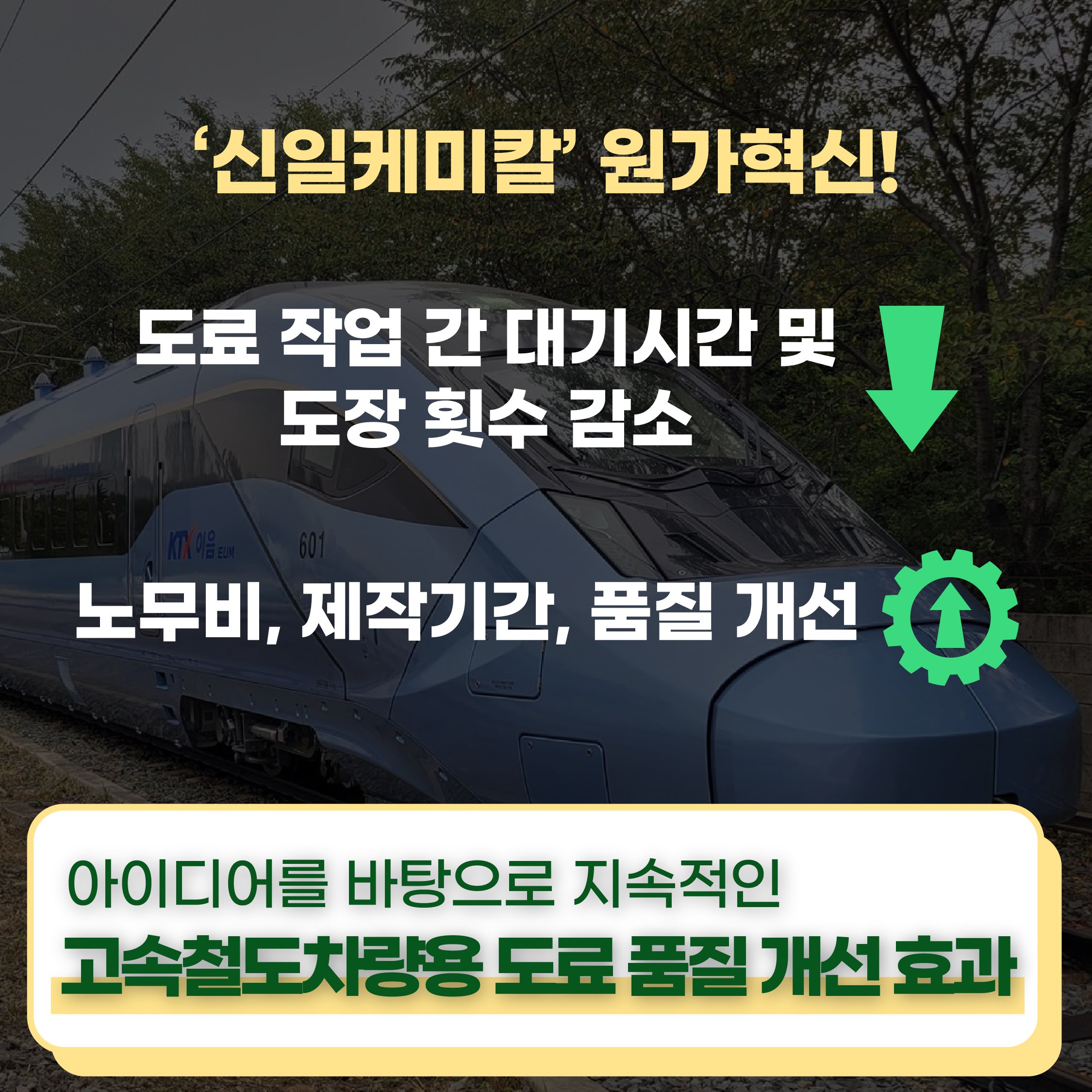 덕분에 고속철도차량 크랙 수정과 도장 횟수가 감소하며 노무비, 제작기간, 품질 등이 개선되는 일석이조의 효과를 누리게 됐어요. 또 도료 가격이 리터 당 40%가량 감소해 재료비 절감효과까지 톡톡히 봤습니다. 현대로템은 해당 아이디어를 바탕으로 자사 고속철도차량 품질을 꾸준히 개선해 나갈 예정이랍니다.