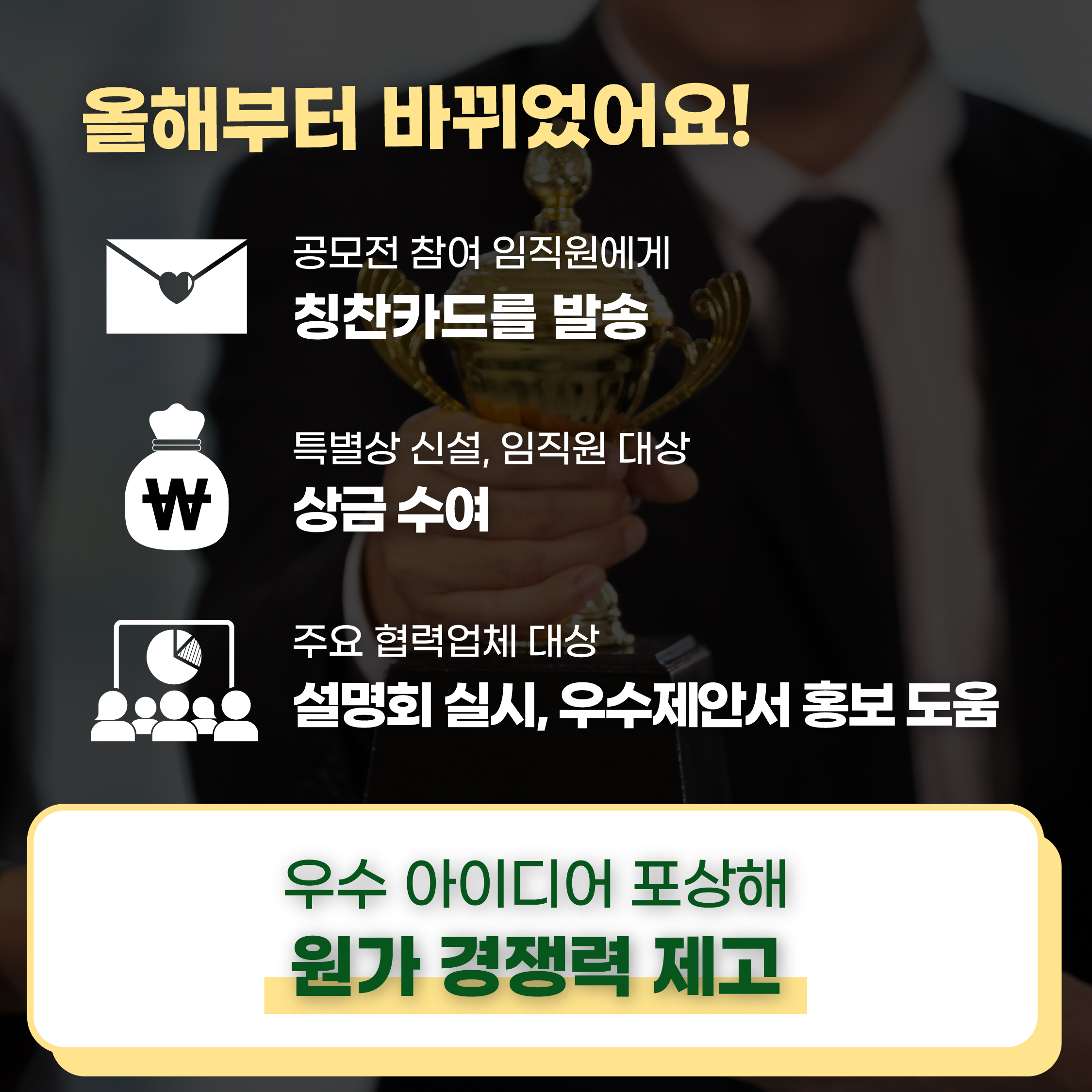 먼저 올해부터 공모전에 참여한 임직원에게 모바일 커피쿠폰 대신 칭찬카드를 전달하는 방식으로 리워드가 변경됐어요. 또 올해부터 특별상을 신설하고 임직원을 대상으로 30만원의 상금을 수여할 예정입니다.