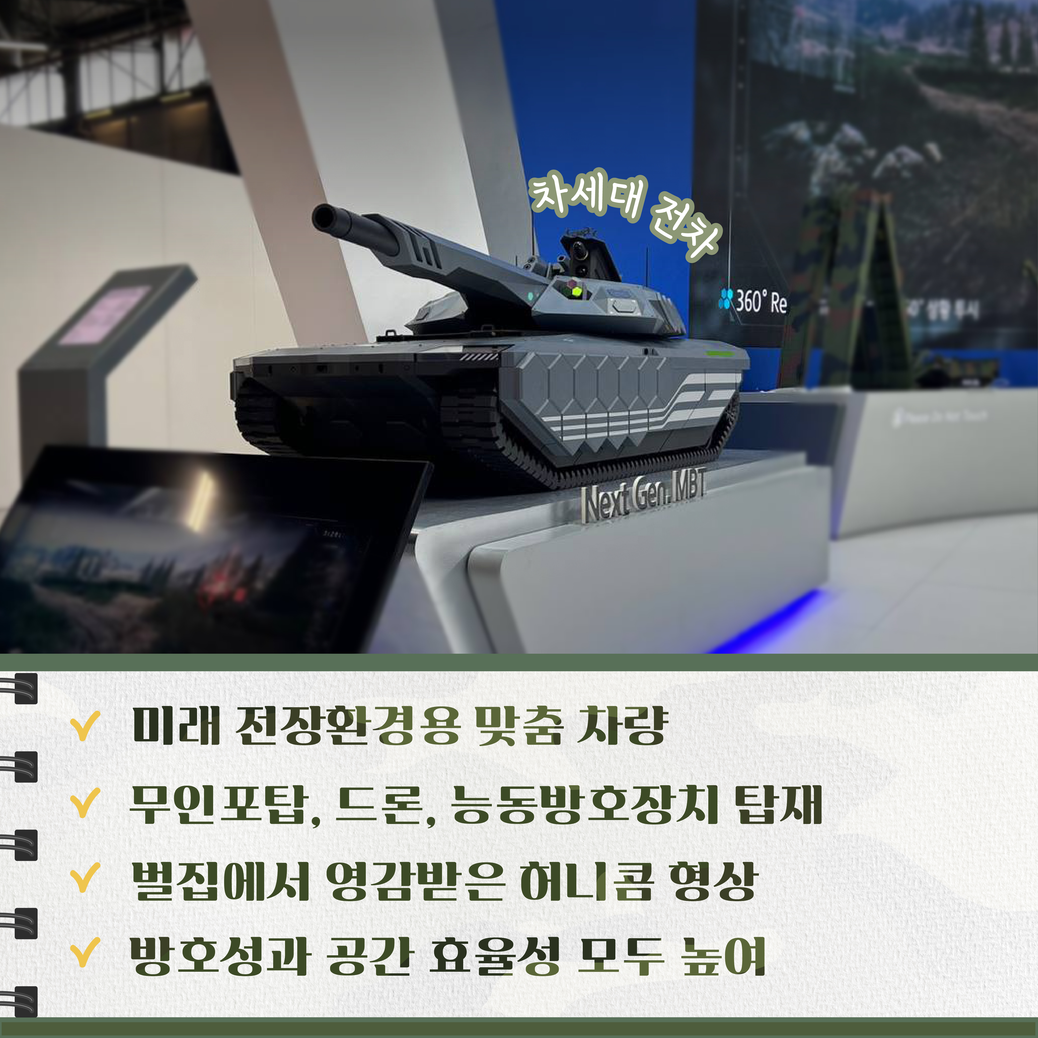 다음으로 현대로템은 해외서 차세대 전차를 모형으로 최초 공개했어요. 해당 전차는 무인포탑, 드론, 능동방호장치, 전동화 기술 등을 장착한 미래 전장환경용 맞춤 차량인데요. 특히 벌집에서 영감을 받은 허니콤 형상의 장갑을 차체와 포탑에 녹여내 방호성과 공간 효율성을 모두 높였습니다.