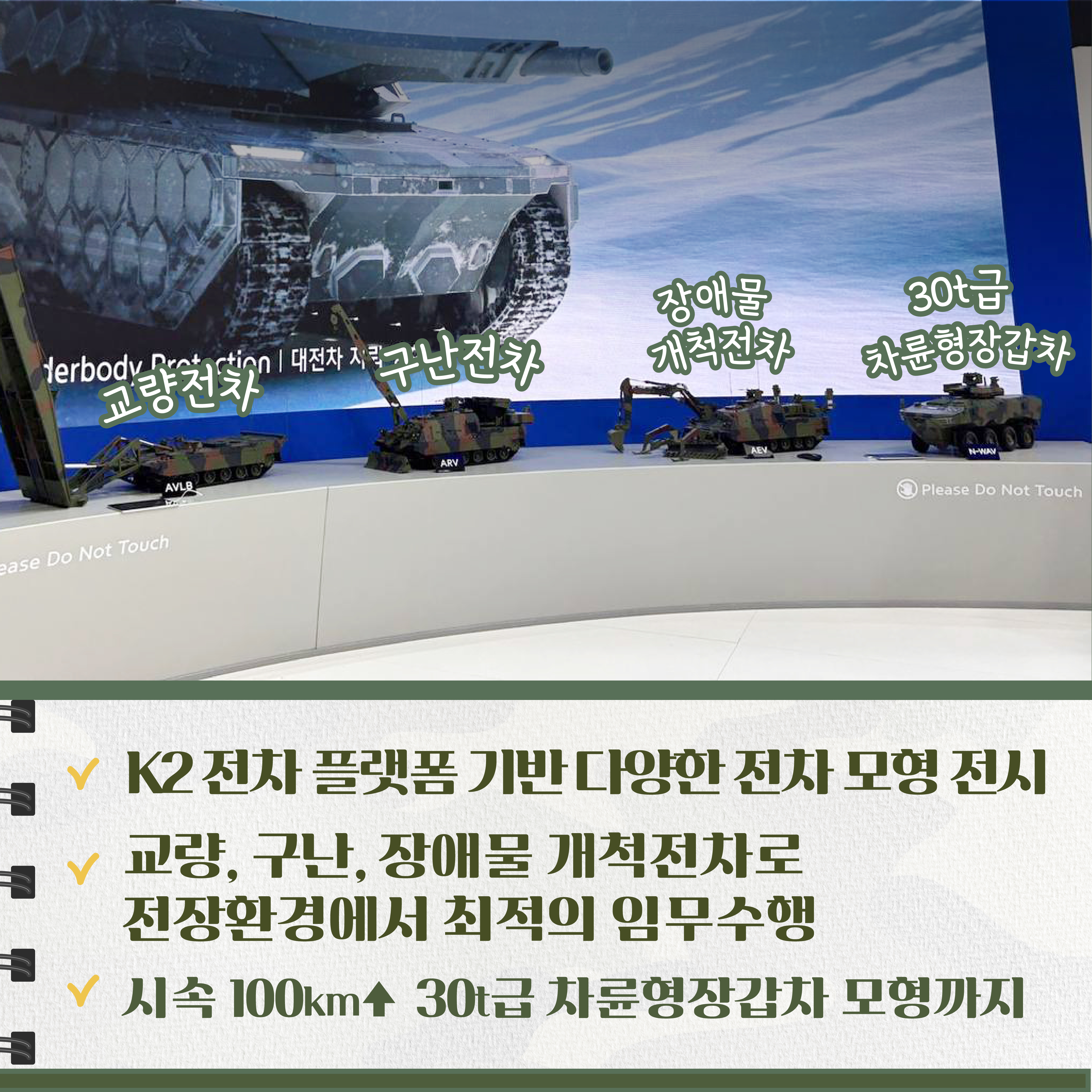 먼저 현대로템의 부스 중앙을 위풍당당하게 지키고 있는 K2EX(K2 EXport)MBT부터 살펴볼까요. K2EX MBT는 K2전차의 수출형 모델로 능동방장치, 원격무장장치(RCWS)등 다양한 장비와 최신 전장품을 탑재해 생존성을 강화한 것이 특징입니다. 원격무장장치, 360도 시야 확보 가능한 전장상황인식장치 등을 더해 전차의 운용성 또한 크게 높였어요.