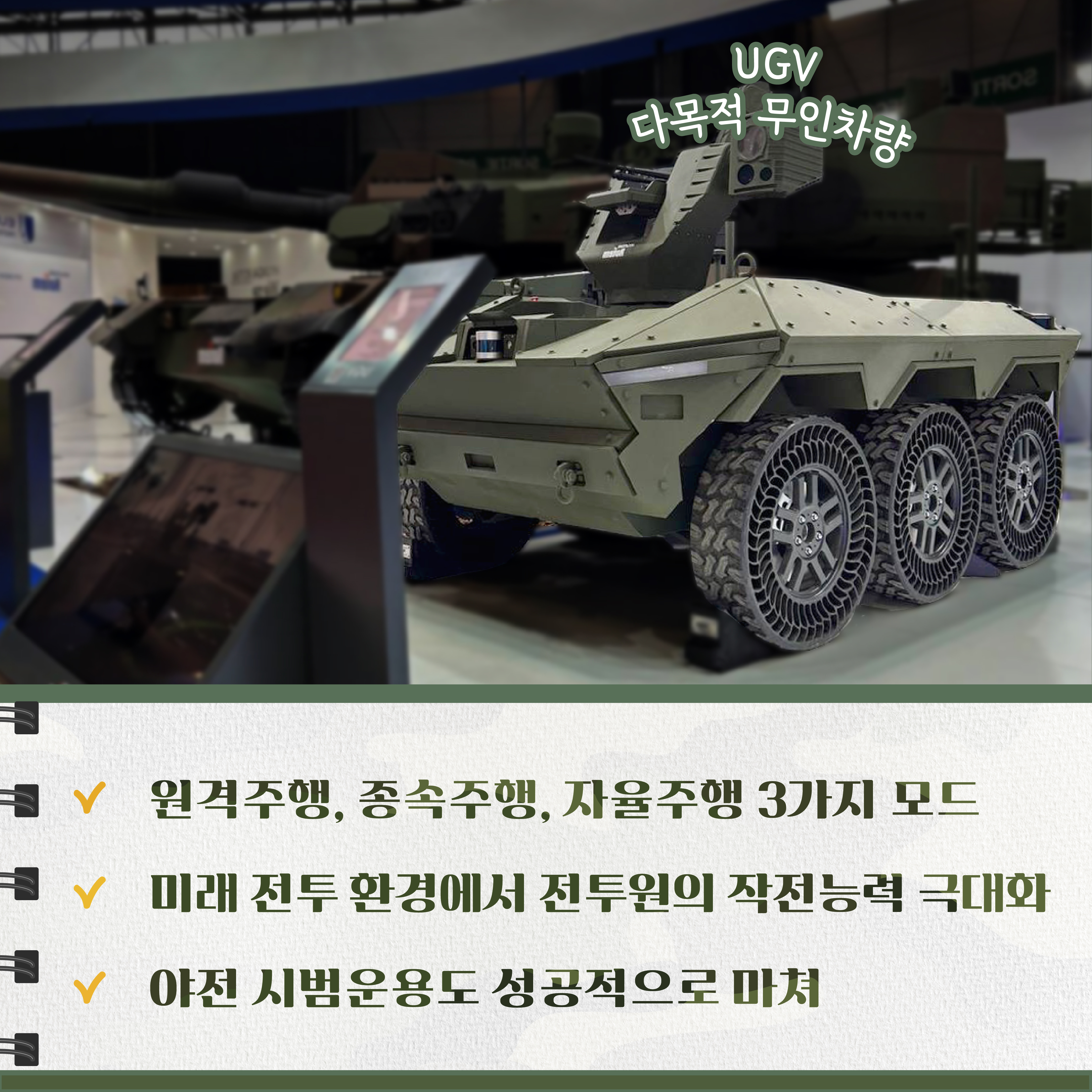이제 미래무인 존으로 이동해 볼까요. K2EX 바로 옆에 놓인 다목적 무인차량(UGV) 모형부터 살펴봐요. 이 무인차량은 미래 전장환경에서 전투원의 작전능력을 극대화하는 데 아주 탁월한 차량으로 국내 최초로 군에 납품되기도 했는데요. 원격주행, 종속주행, 자율주행 등 총 3가지 주행모드가 가능한데요. GOP, DMZ 등 야전에서 시범 운용을 성공적으로 마쳤습니다.